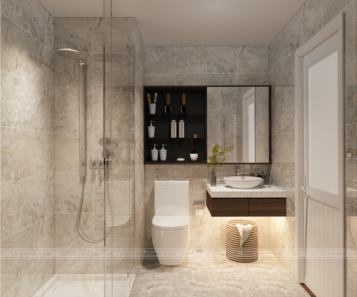 Phòng tắm, nhà tắm, nhà vệ sinh của căn hộ chung cư Trung Yên II được lựa chọn thiết kế và thi công theo gam màu sắc trung tính. Chiếc gương soi hình chữ nhật lớn được bố trí khoa học và tiện dụng cho không gian nội thất phòng tắm này. Những sản phẩm nội thất phòng tắm tại căn hộ chung cư này như: bồn chậu rửa mặt, bồn cầu, vòi sen tắm, vòi chậu rửa mặt đều là những dòng sản phẩm cao cấp và chất lượng. Riêng phần phòng tắm kính của gia chủ được đơn vị thi công nội thất V-Home trực tiếp sản xuất và lắp đặt. Do vậy về chất lượng hay bảo hành cũng đều thuận tiện cho gia chủ.