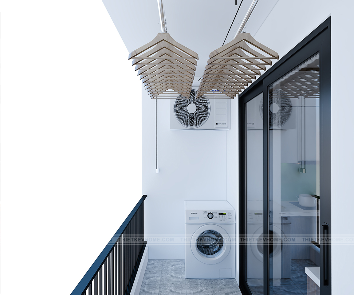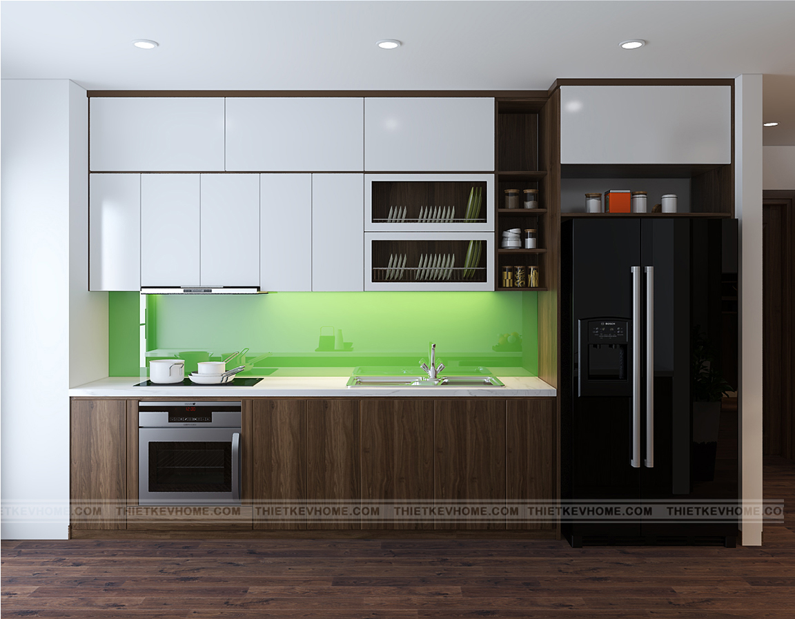 Thiết kế tủ bếp hình chữ I nhỏ gọn, tiện ích và có tính ứng dụng cao. Thiết kế phòng bếp hướng đi ra logia có ánh sáng tràn ngập mang lại sự sáng sủa cho không gian nội thất. Đối diện là tủ kho, tủ trang trí thiết kế dạng tủ thấp để không gian nội thất trở lên thông thoáng, không bị choáng ngợp bởi quá nhiều hệ thống tủ.