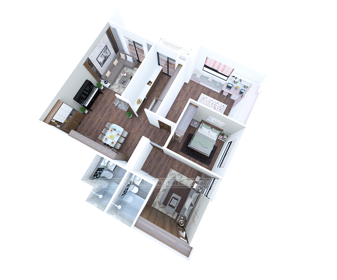Bước vào căn hộ, bạn có thể dễ dàng nhìn trọn vẹn không gian đa chiều: Nội thất phòng khách, nội thất phòng ăn, phòng bếp và ban công. Đi vào không gian riêng tư phía trong là phòng ngủ master, phòng ngủ ông bà và phòng ngủ con gái.
