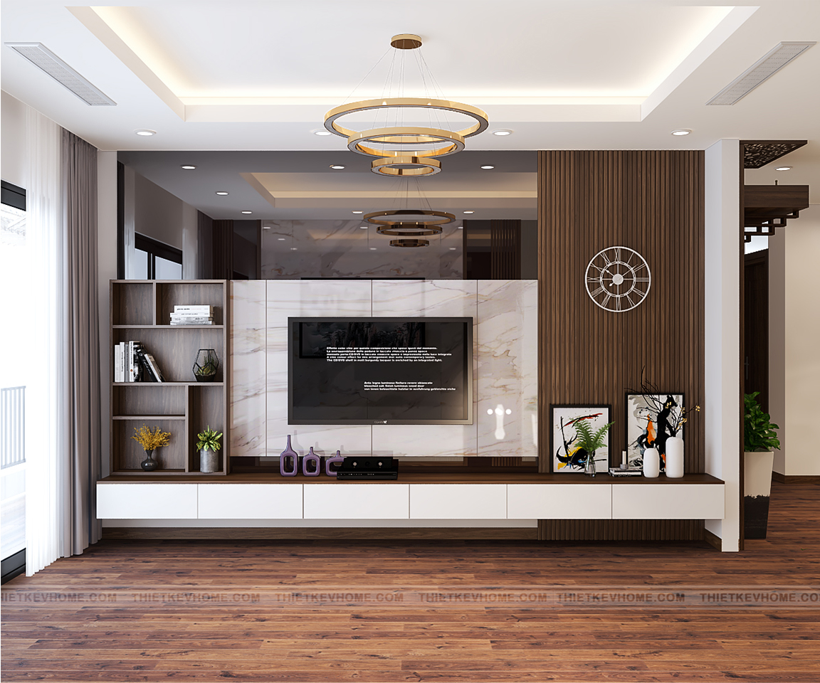 Vách ốp kệ ti vi là điểm nhấn chính của phòng khách, tạo nên sự khác biệt cho không gian nội thất. Vách ốp là sự kết hợp hoàn hảo giữa các vật liệu nội thất: Gỗ, kính và đá.
