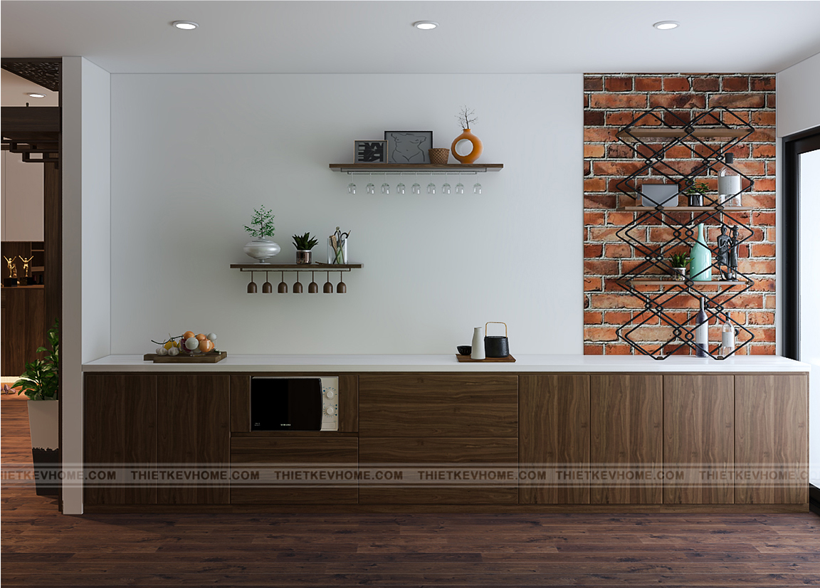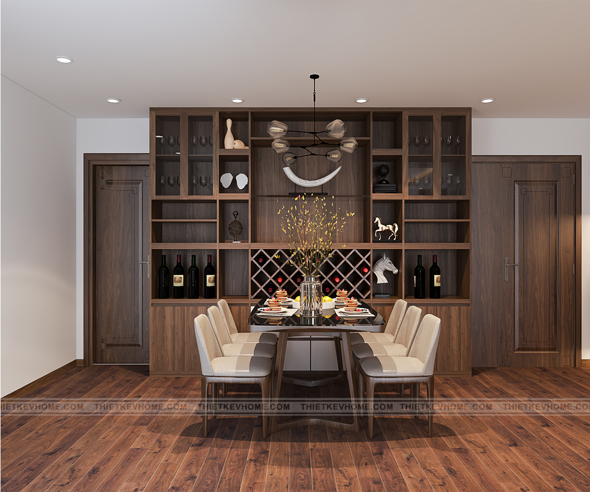 Thiết kế phòng ăn mang một nâu của gỗ óc chó ấm cúng mà sang trọng. Trong phòng ăn thiết kế tủ rượu sang trọng và bắt mắt thể hiện đẳng cấp và sự thành đạt của gia chủ. Bàn ăn 6 người ngồi với mặt kính cường lực dễ lau chùi sạch sẽ và bóng loáng. Ghế Grace không tay bọc da êm ái giúp gia chủ có thể thoải mái thưởng thức bữa cơm gia đình.