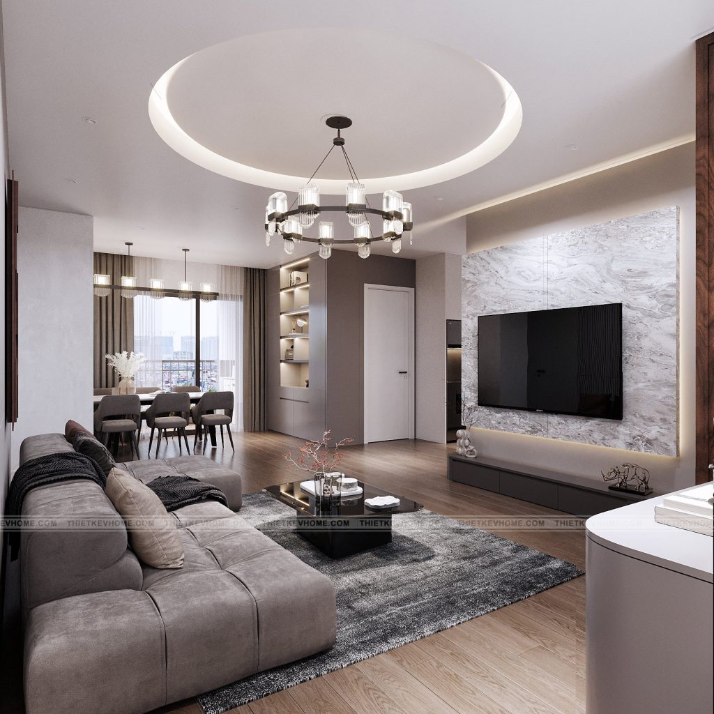 Bức tường ốp PVC vân mây phía sau tivi là điểm nhấn sang trọng, được viền đèn hắt âm trần giúp tôn lên chiều sâu của không gian. Trần nhà sử dụng thiết kế trần giật cấp hình tròn, kết hợp đèn chùm pha lê tạo nên cảm giác mềm mại và đẳng cấp.
