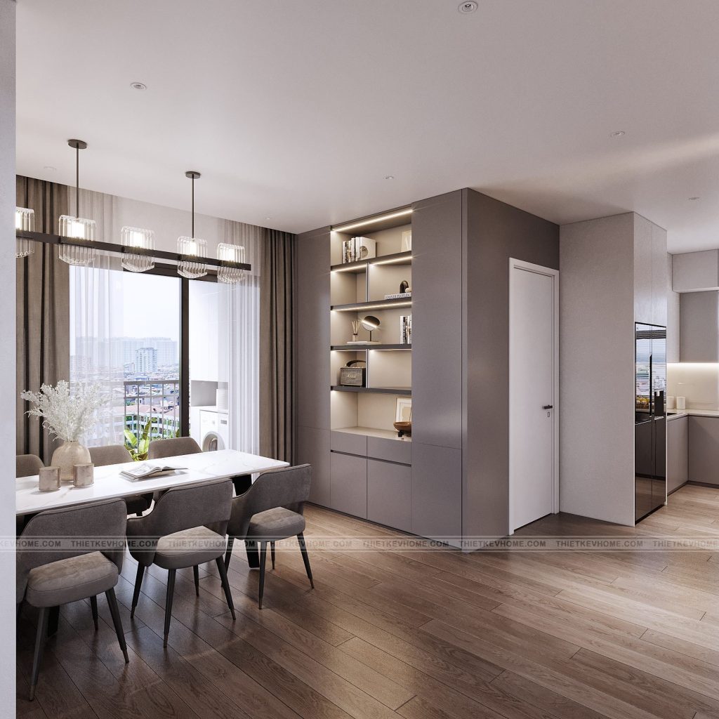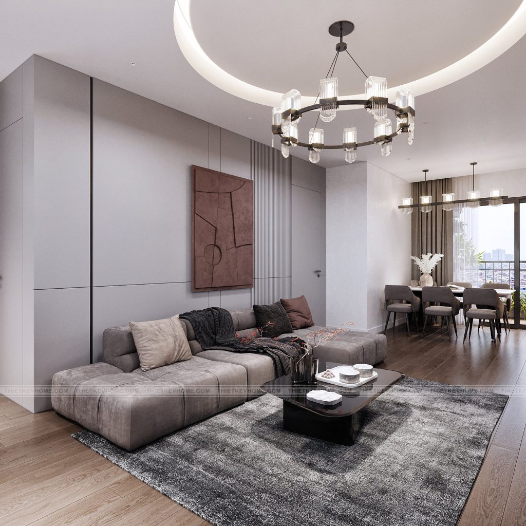 Căn hộ chúng tôi muốn giới thiệu đến khách hàng được các kiến trúc sư của V-Home thiết kế theo phong cách nội thất hiện đại (Modern Style) với hơi hướng sang trọng và tinh giản (Modern Luxury). Tông màu trung tính chủ đạo gồm xám, be, nâu gỗ và trắng giúp tạo nên cảm giác hài hòa, ấm áp mà vẫn toát lên nét thanh lịch. Mọi chi tiết đều được tiết chế, hướng đến sự tối giản nhưng không đơn điệu.
