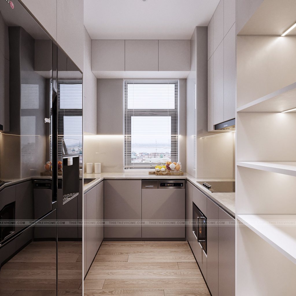 Gian bếp riêng được các kiến trúc sư thiết kế theo dạng chữ U đã tối ưu hóa diện tích sử dụng và thuận tiện trong thao tác nấu nướng. Hệ tủ bếp trên – dưới màu xám nhạt, kết hợp mặt bàn đá sáng tạo nên cảm giác sạch sẽ, hiện đại.
