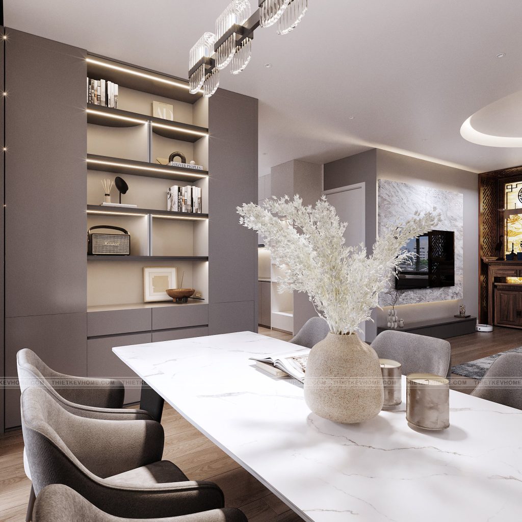 Không gian phòng ăn được bố trí liền kề với phòng khách, tạo nên sự liên thông mở rộng không gian. Bàn ăn mặt đá trắng vân mây cùng ghế bọc nỉ xám duy trì phong cách thống nhất.