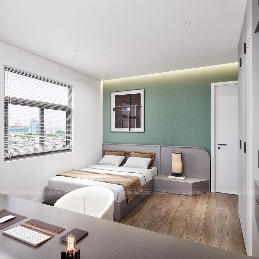 Giường ngủ thiết kế thấp, vuông vức, đầu giường liền mạch với tap mang đường cong nhẹ nhàng – chi tiết nhỏ nhưng giúp tổng thể mềm mại hơn. Chăn ga gối với tông trắng và nâu be tạo nên sự ấm áp, kết hợp cùng bức tường xanh pastel phía sau làm điểm nhấn, khiến căn phòng trở nên sinh động mà vẫn giữ được sự yên bình.