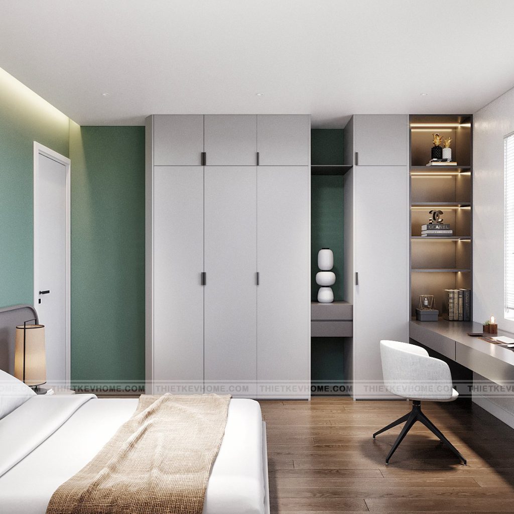 Việc sử dụng hệ tủ áo âm tường cao kịch trần kết hợp bàn học – làm việc áp sát cửa sổ là giải pháp hoàn hảo cho căn phòng nhỏ. Bên cạnh đó, các mảng kệ trang trí có đèn led hắt sáng nhẹ, không chỉ tăng công năng lưu trữ mà còn đóng vai trò như yếu tố trang trí tinh tế, giúp không gian thêm chiều sâu và hiện đại.