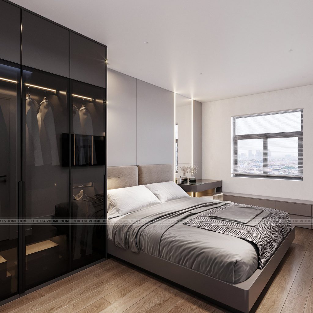 Giường ngủ – Tâm điểm êm dịu: được bọc nệm cao cấp tạo cảm giác thoải mái, thân thiện. Bố cục giường đặt ở trung tâm căn phòng giúp tận dụng ánh sáng tự nhiên từ ô cửa sổ lớn bên phải, đồng thời mở rộng tầm nhìn ra không gian thành phố – một lựa chọn lý tưởng cho lối sống hiện đại trong chung cư cao tầng.