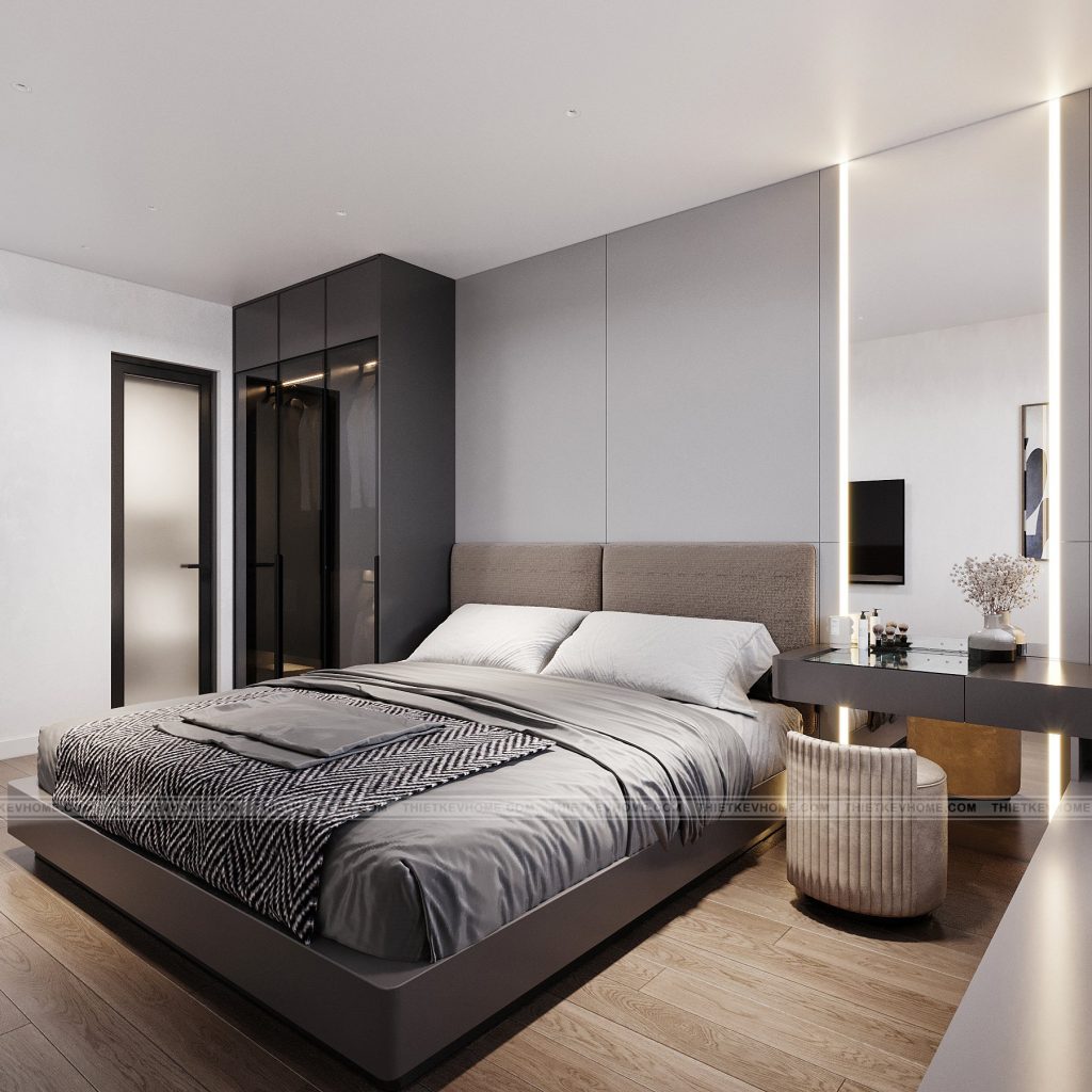 Phòng ngủ master tiếp tục được V-Home duy trì ngôn ngữ thiết kế từ đầu – hiện đại tối giản, với bảng màu ‘xám, be, đen, nâu gỗ’ đồng nhất cùng tổng thể căn hộ. Mỗi chi tiết trong không gian được tinh chỉnh tỉ mỉ nhằm mang đến cảm giác yên bình, sang trọng và thư giãn tuyệt đối.