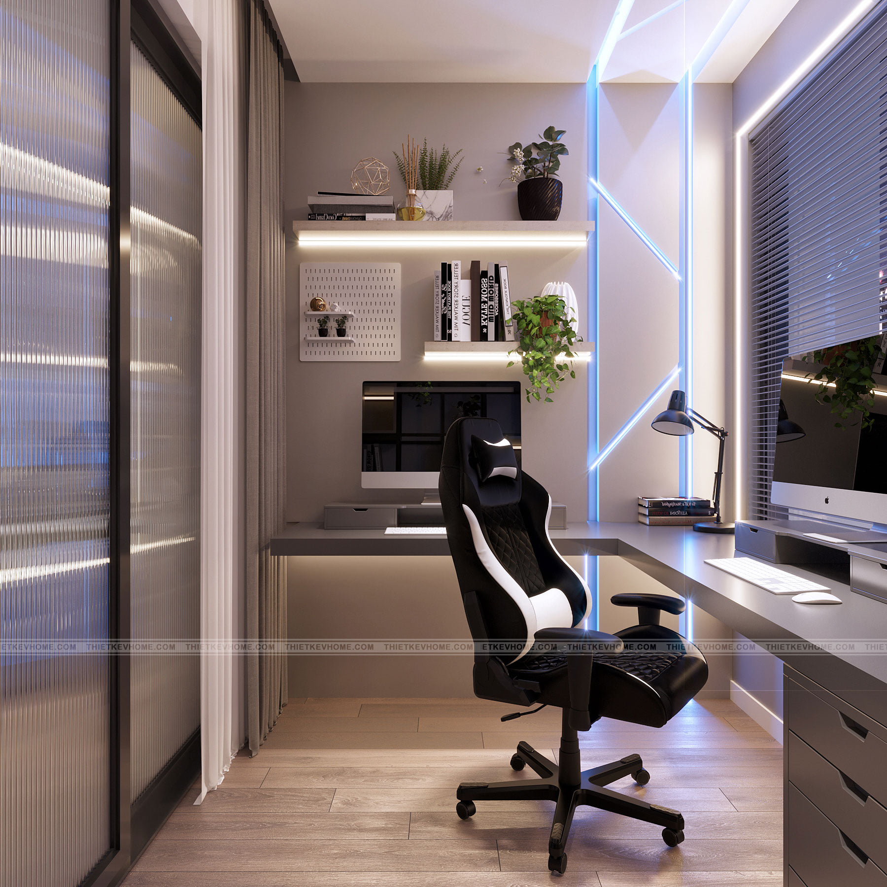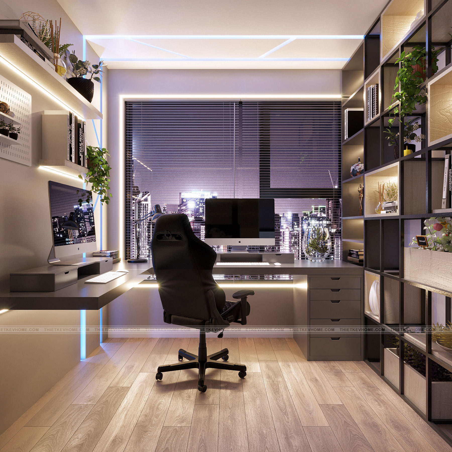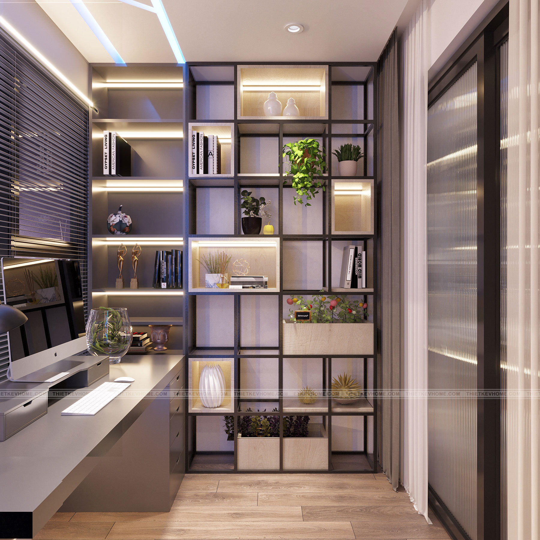 Phòng làm việc bố trí bàn làm việc và giá sách, tạo một nơi làm việc lý tưởng cho chủ nhân căn phòng những khi cần một nơi làm việc riêng tư và yên tĩnh tại nhà.