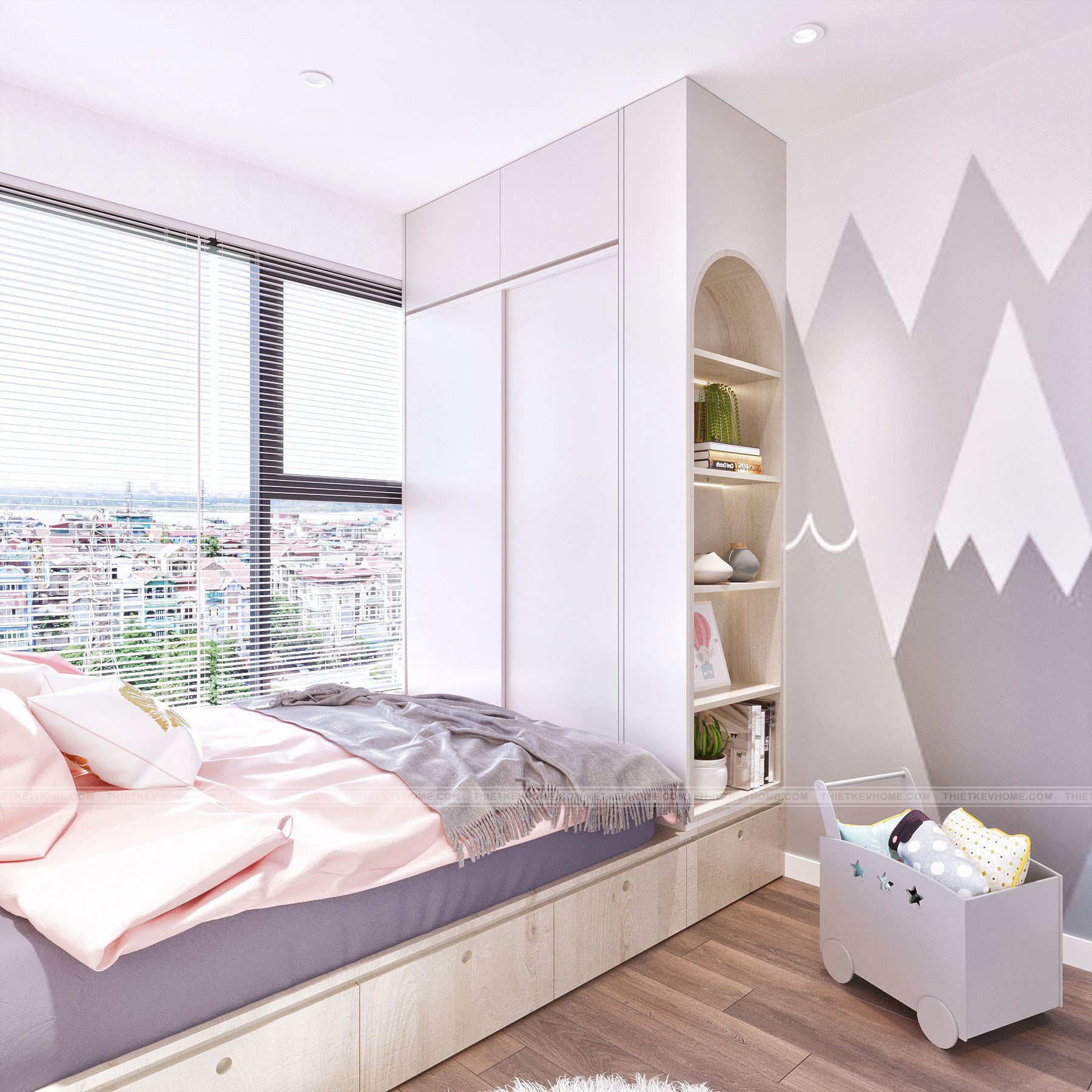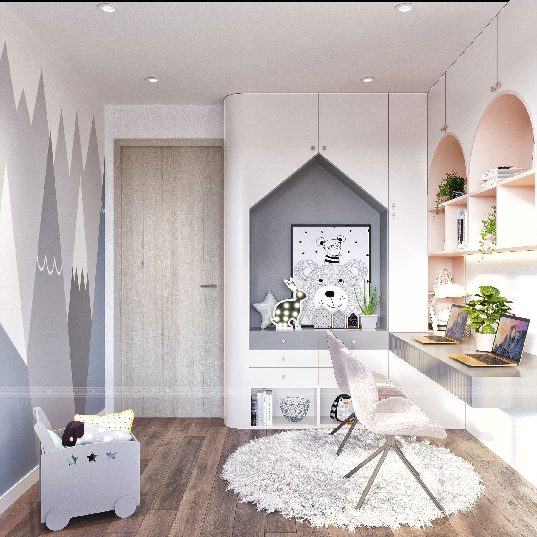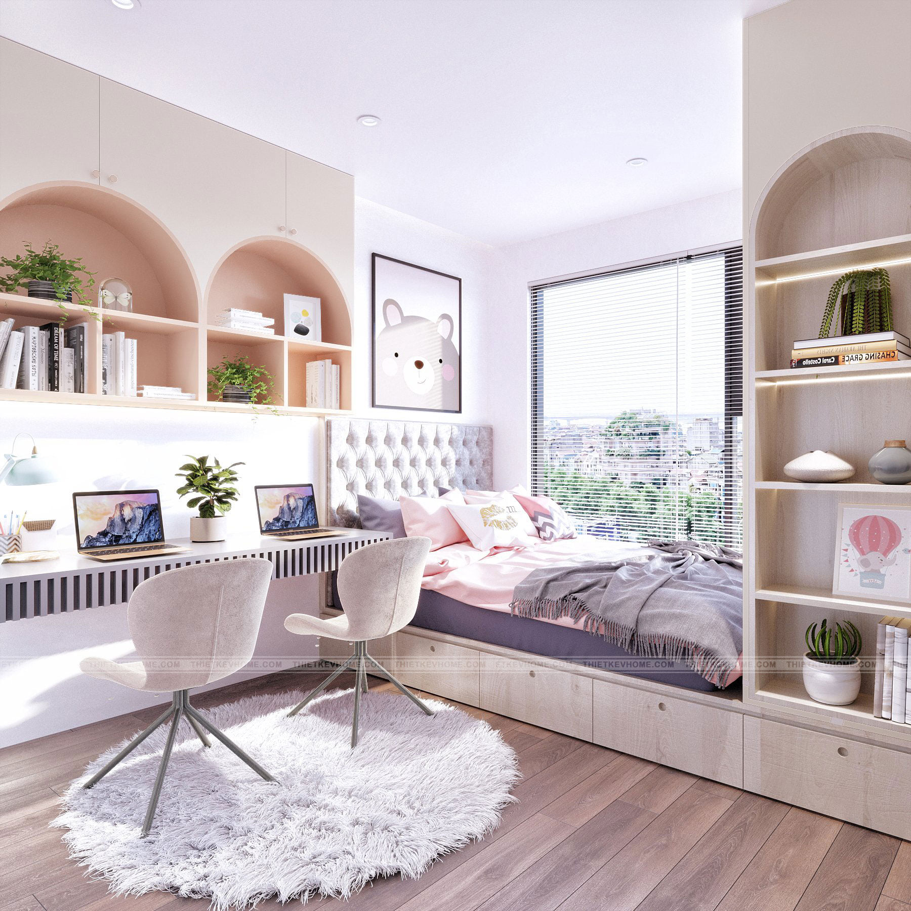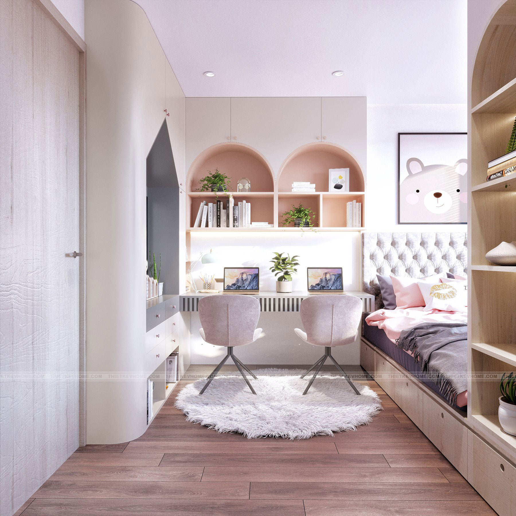 Mang ánh sáng và lấp đầy không gian đón ánh bình minh đến hoàng hôn, mang lại màu sắc lộng lẫy phả vào căn phòng của bé, phòng ngủ nhỏ nhuốm màu hồng thơ ngây dịu dàng và dễ thương rất phù hợp cho hai bé gái xinh xắn. Căn phòng được thiết kế với đầy đủ không gian nô đùa vui chơi, học tập, nghỉ ngơi thư giãn, đủ góc riêng tư tự do và tự lập cho các bé gái đáng yêu của gia đình.