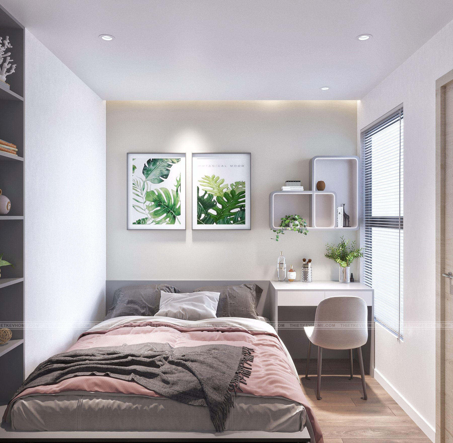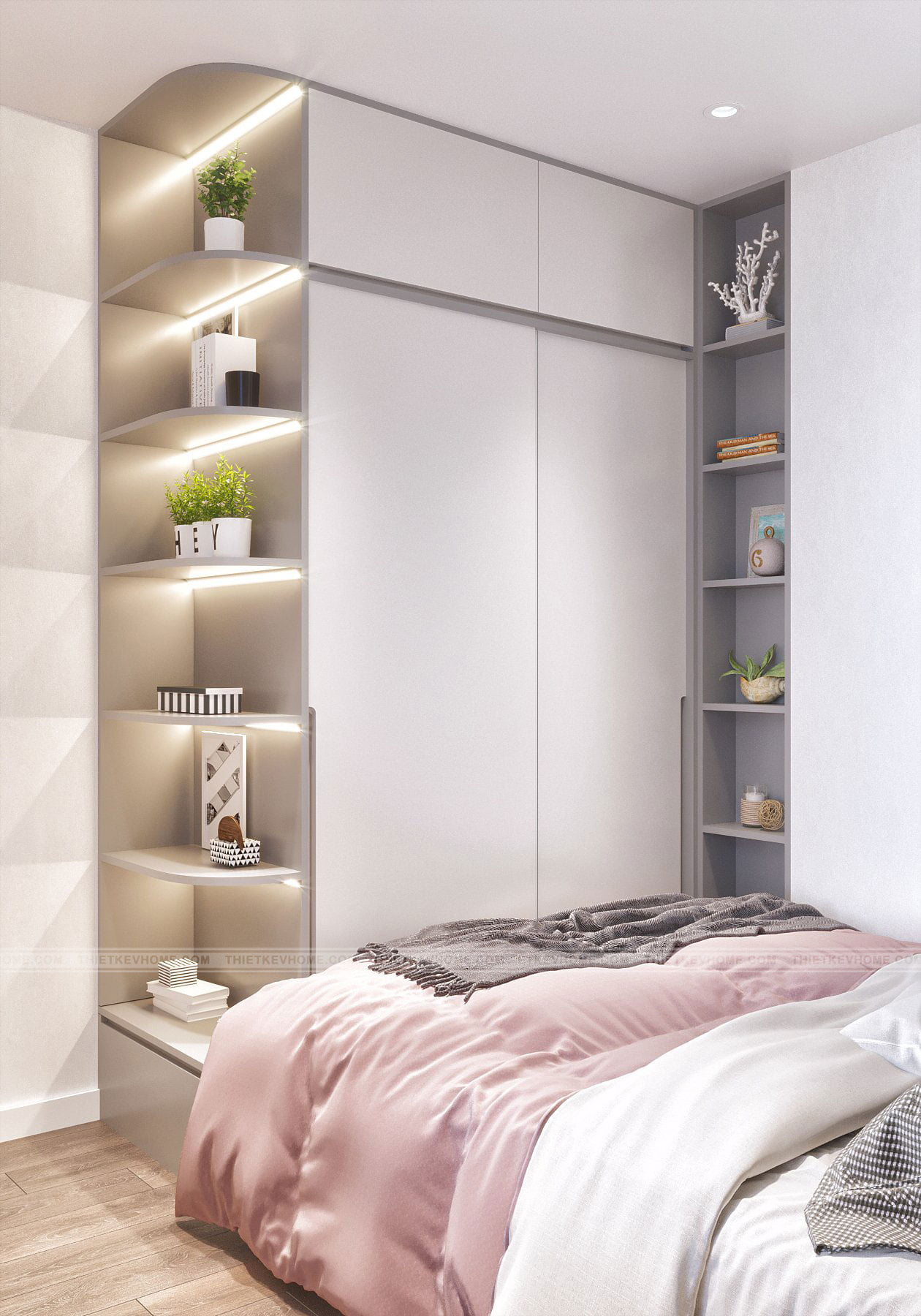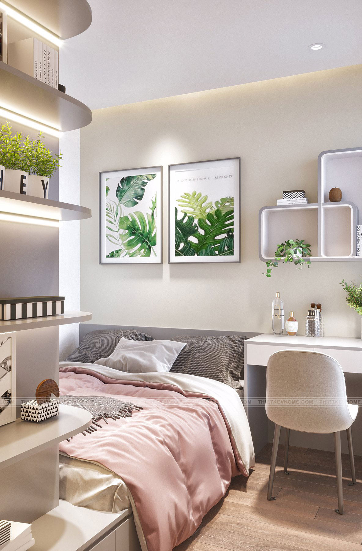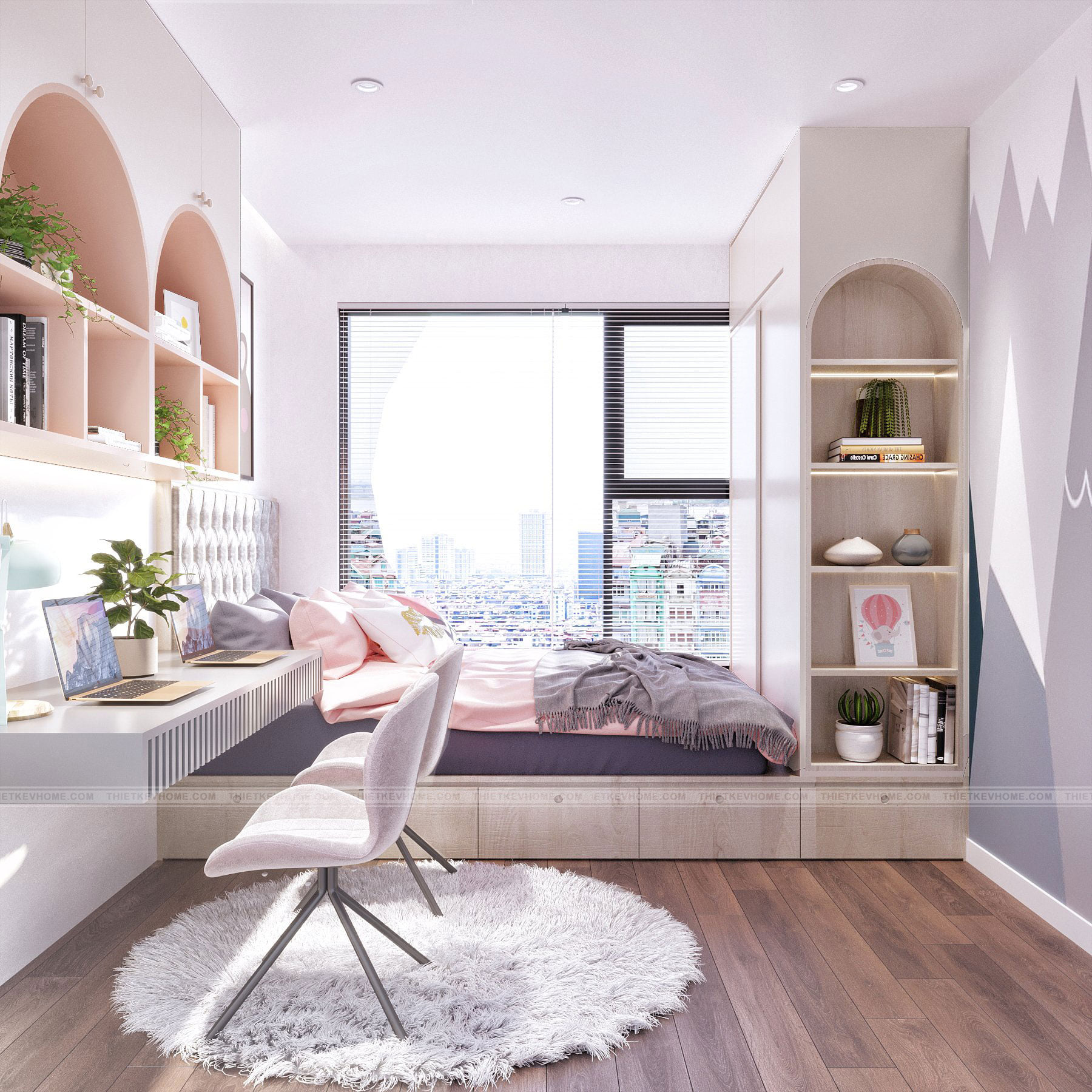 Mang ánh sáng và lấp đầy không gian đón ánh bình minh đến hoàng hôn, mang lại màu sắc lộng lẫy phả vào căn phòng của bé, phòng ngủ nhỏ nhuốm màu hồng thơ ngây dịu dàng và dễ thương rất phù hợp cho hai bé gái xinh xắn. Căn phòng được thiết kế với đầy đủ không gian nô đùa vui chơi, học tập, nghỉ ngơi thư giãn, đủ góc riêng tư tự do và tự lập cho các bé gái đáng yêu của gia đình.
