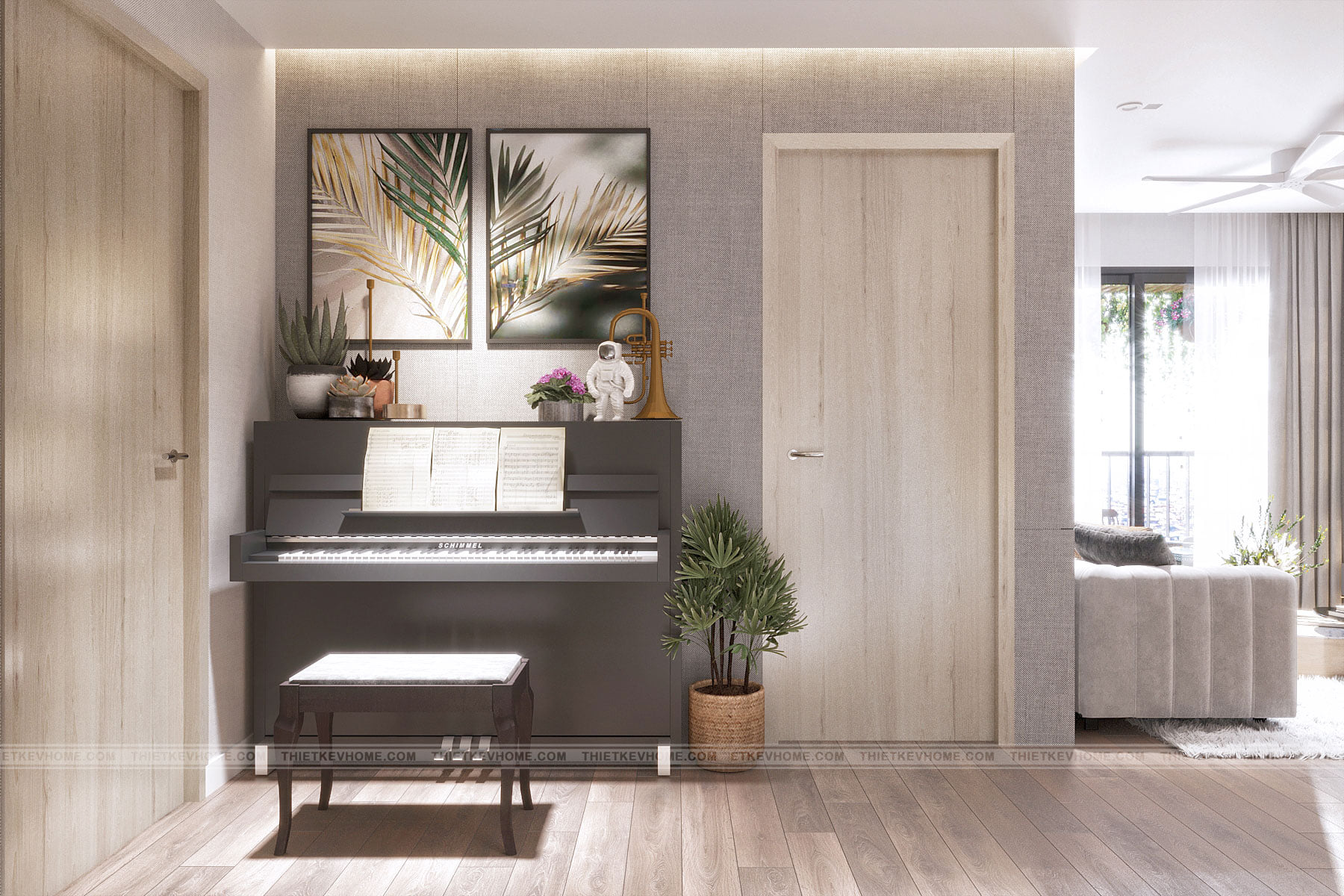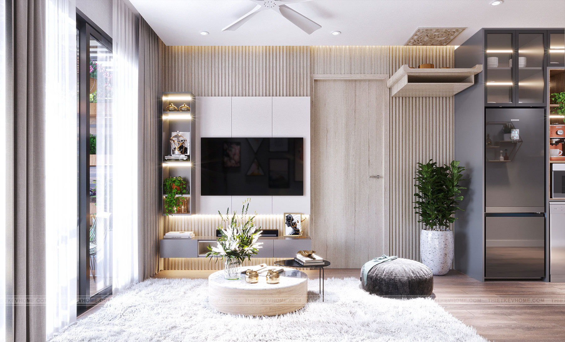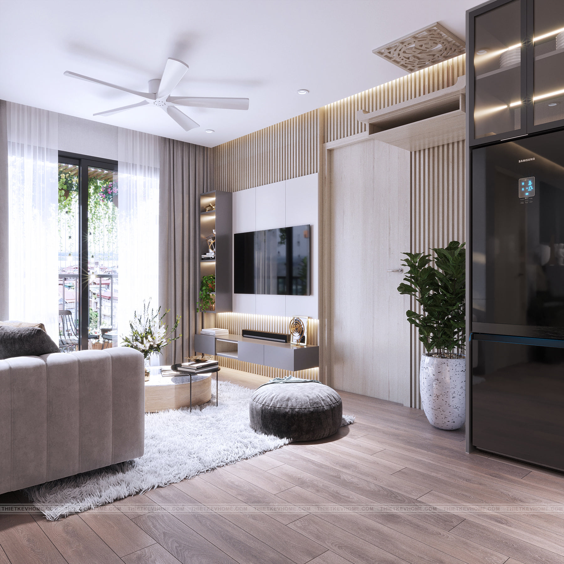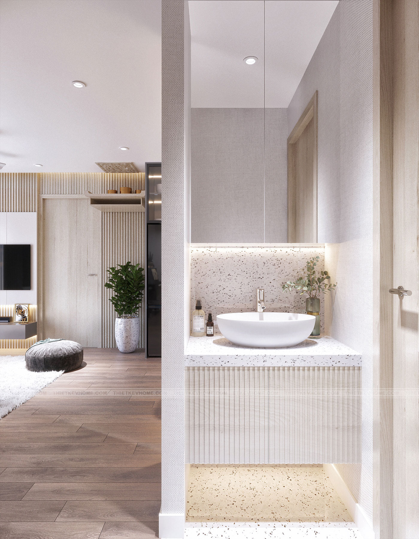 Sự kết hợp hài hòa từ chất liệu cho đến tổng thể màu sắc, các gam màu trung tính nhẹ nhàng và trang nhã tạo sự thống nhất liền mạch trong không gian ngôi nhà, góp phần tạo nên vẻ đẹp tự nhiên mà gần gũi cho căn hộ. Thiết kế căn hộ chung cư Vinsmart được thiết kế tinh giản, màu sắc nhẹ nhàng, trầm ấm và áp dụng nội thất hiện đại tối giản vào không gian tạo cảm giác yên tĩnh và thoải mái cho cả gia đình. Những đường nét rõ ràng rành mạch nhưng không hề thô cứng mà mềm mại.