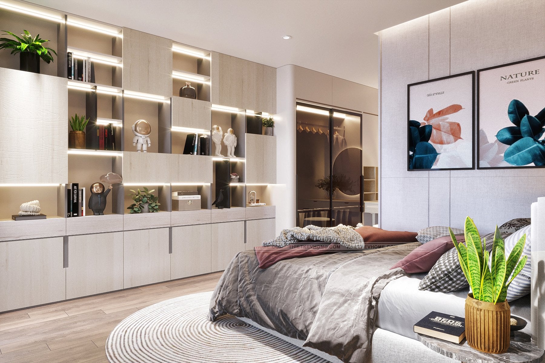 Hệ tủ ở phía đối diện sofa với nhiều hộc tủ có kích thước khác nhau là một cách thiết kế thông minh vừa tăng điểm nhấn cho không gian phòng ngủ, vừa tạo các khoảng không lưu trữ giúp căn phòng trở nên gọn gàng và ngăn nắp, đồng thời đảm bảo sự tiện nghi, tinh tế và vẻ đẹp thẩm mỹ của nội thất phòng ngủ master.