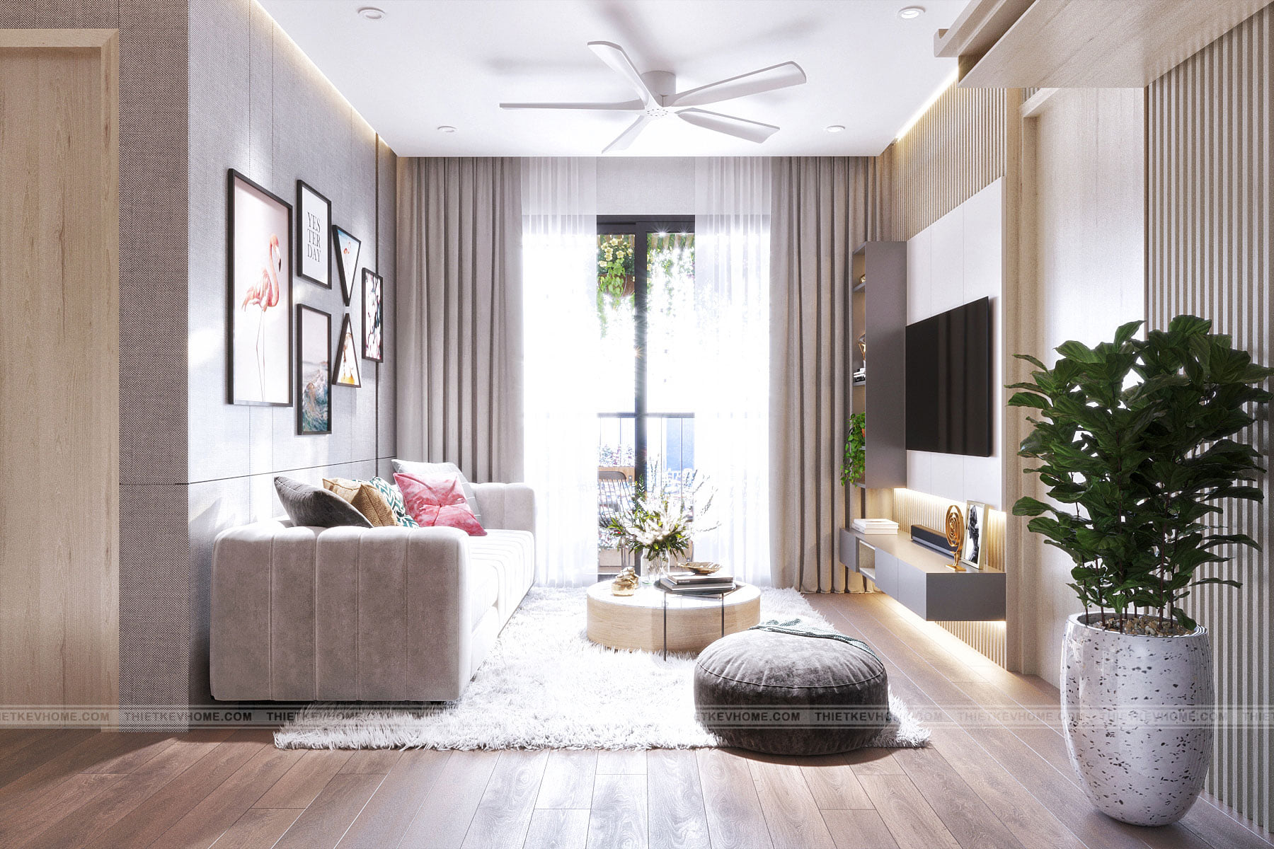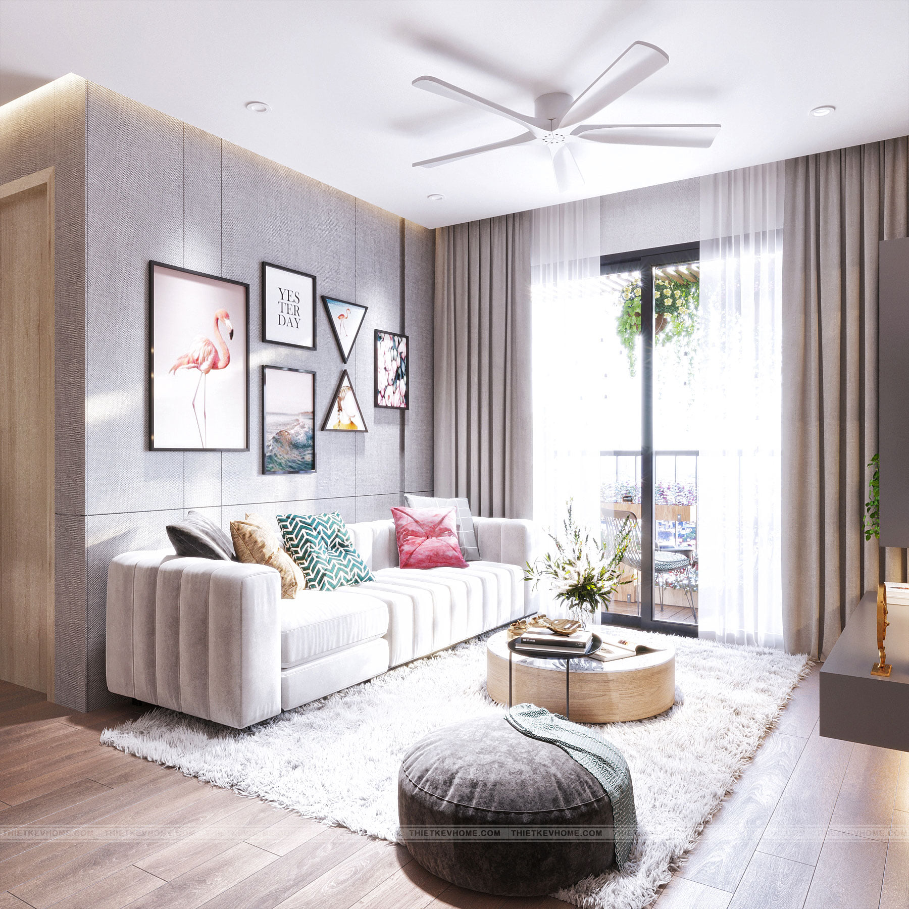 Không gian phòng khách nhìn thẳng ra ổ cửa lớn tràn ngập ánh sáng, màu sắc thiên nhiên hoa cỏ cây lá xanh tươi được điểm xuyết cho căn phòng tràn đầy sức sống.