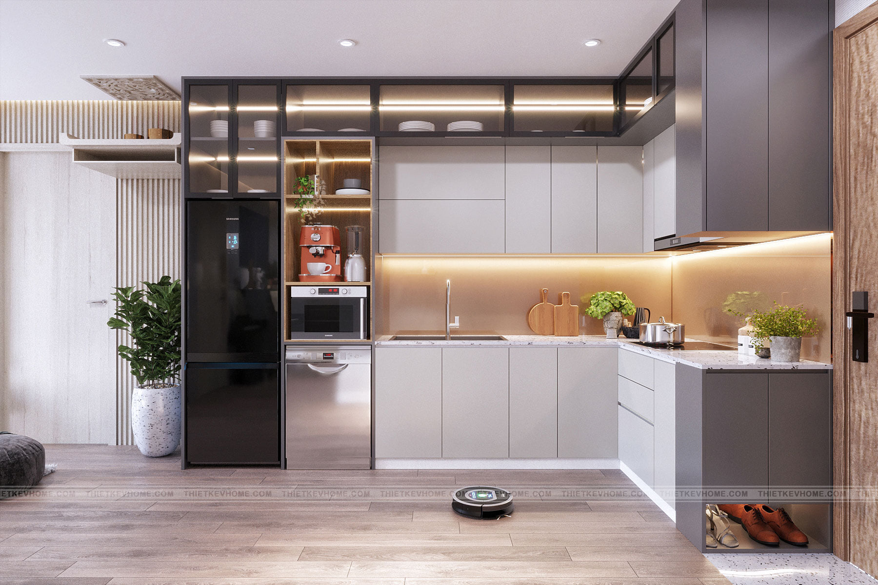 Không gian bếp và phòng khách được thiết kế mở, phá bỏ khuôn mẫu truyền thống để tạo ra tổng thể chung rộng rãi và thoáng đãng. Một không gian bếp nối liền phòng khách tạo sự ấm cúng cho toàn bộ thành viên trong gia đình.