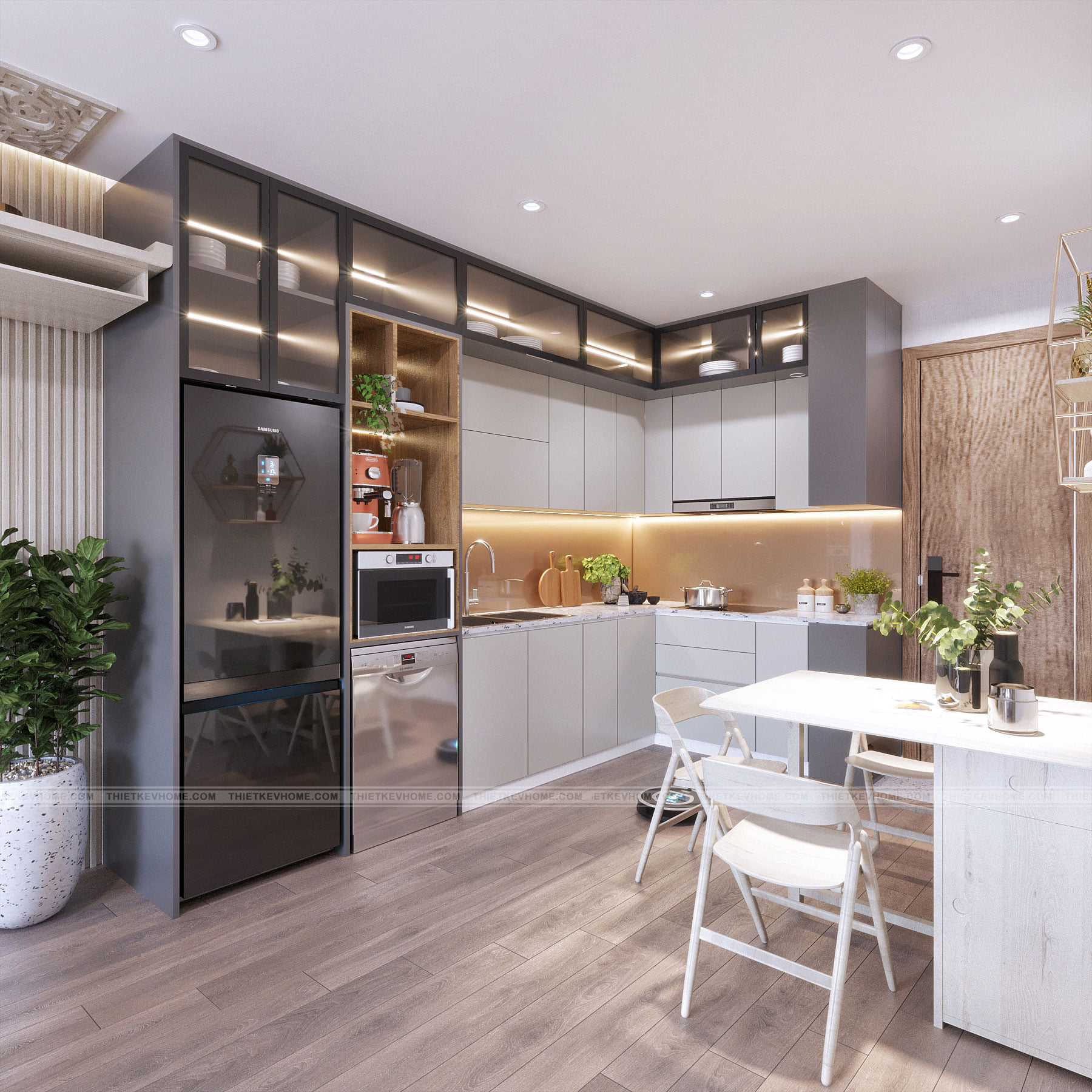 Bên cạnh là bàn ăn của gia đình. Bởi gia đình ít thành viên nên nhóm KTS lựa chọn bàn ăn nhỏ gọn, xinh xắn. Đối diện là khu vực bếp nấu của căn hộ. Khu vực nấu nướng được thiết kế hệ tủ bếp hình chữ L phù hợp với vị trí và diện tích căn bếp. Bàn bếp, tủ bếp trên dưới được tính toán và phân chia khoa học hợp lý với các khu vực công năng hợp lý nhằm tạo một không gian ngăn nắp gọn gàng và tiện nghi sử dụng cho người nội trợ. Sự kết hợp các gam màu trung tính nhẹ nhàng cũng rất hợp lý, bổ trợ cho nhau tạo nên một cảm giác ấm cúng cho căn bếp.