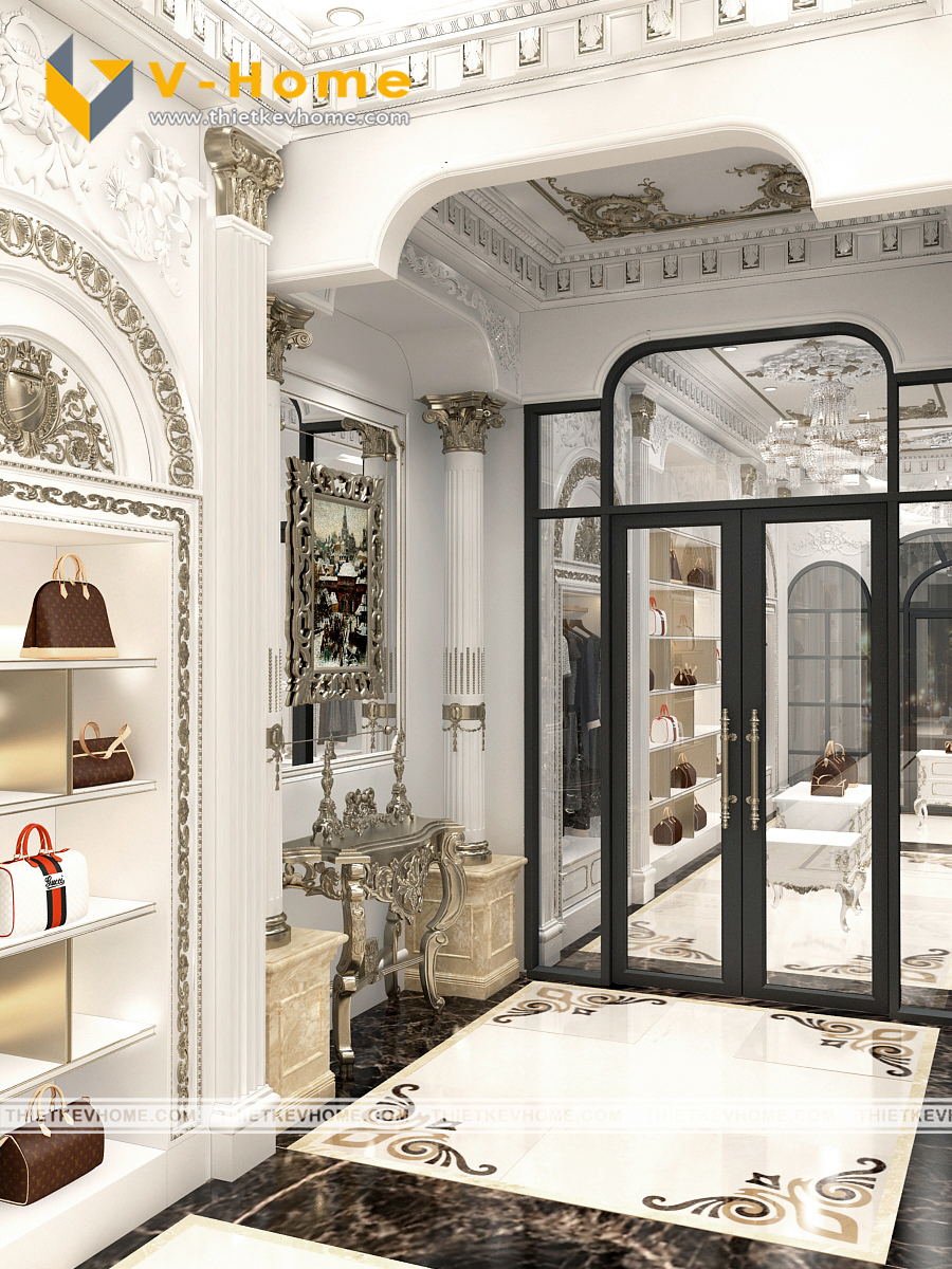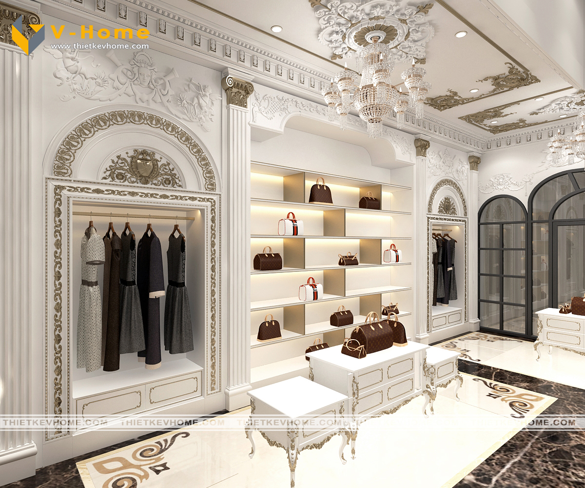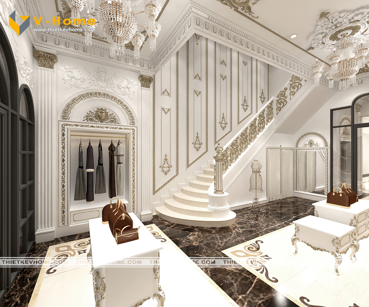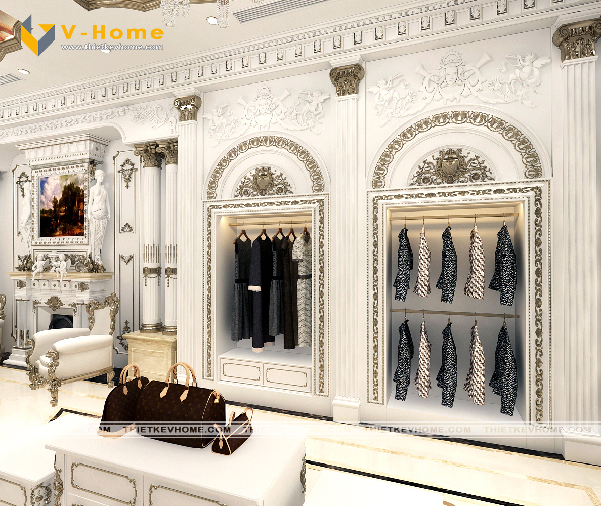 Cửa hàng thời trang cao cấp mang một vẻ đẹp tinh tế, sang trọng, đẳng cấp Châu Âu, qua đó khẳng định chất lượng sản phẩm và đối tượng khách hàng mà cửa hàng muốn hướn tới. Các chi tiết phào chỉ được đắp nổi, nhấn nhá dát vàng tạo điểm nhấn cho không gian nội thất. Sàn lát nền đá hoa cương và trần xuyên sáng hoa văn cổ điển góp phần tôn lên vẻ đẹp cổ điển của không gian nội thất. Không gian tiếp khách được nhấn bởi các trụ tròn vững chắc với lò nướng giả, cùng các bức tượng trắng được điêu khắc bởi các nghệ nhân. Mỗi một tủ treo quần áo đều như một ô cửa sổ, đường phào chỉ bao quanh, với ánh đèn led bên trong tạo nên vẻ đẹp lung linh của sản phẩm, thu hút khách hàng.