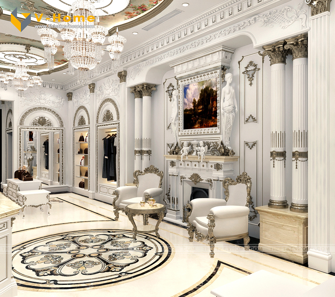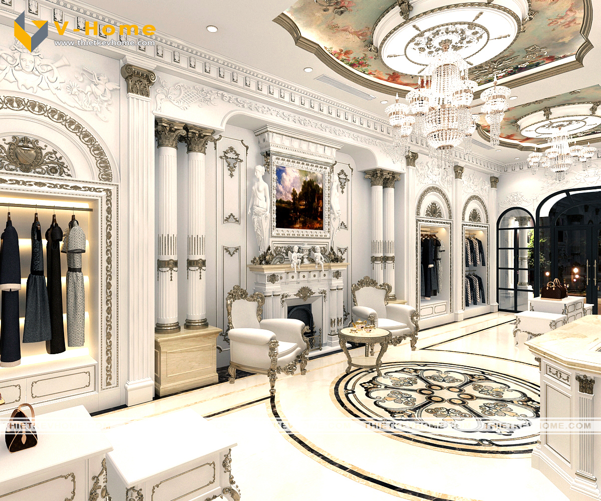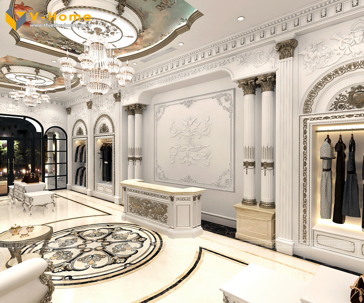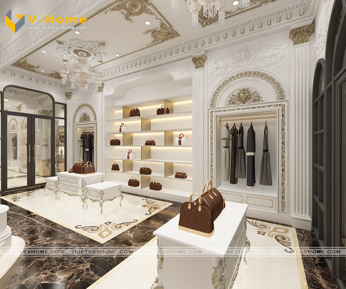 Cửa hàng thời trang cao cấp mang một vẻ đẹp tinh tế, sang trọng, đẳng cấp Châu Âu, qua đó khẳng định chất lượng sản phẩm và đối tượng khách hàng mà cửa hàng muốn hướn tới. Các chi tiết phào chỉ được đắp nổi, nhấn nhá dát vàng tạo điểm nhấn cho không gian nội thất. Sàn lát nền đá hoa cương và trần xuyên sáng hoa văn cổ điển góp phần tôn lên vẻ đẹp cổ điển của không gian nội thất. Không gian tiếp khách được nhấn bởi các trụ tròn vững chắc với lò nướng giả, cùng các bức tượng trắng được điêu khắc bởi các nghệ nhân. Mỗi một tủ treo quần áo đều như một ô cửa sổ, đường phào chỉ bao quanh, với ánh đèn led bên trong tạo nên vẻ đẹp lung linh của sản phẩm, thu hút khách hàng.