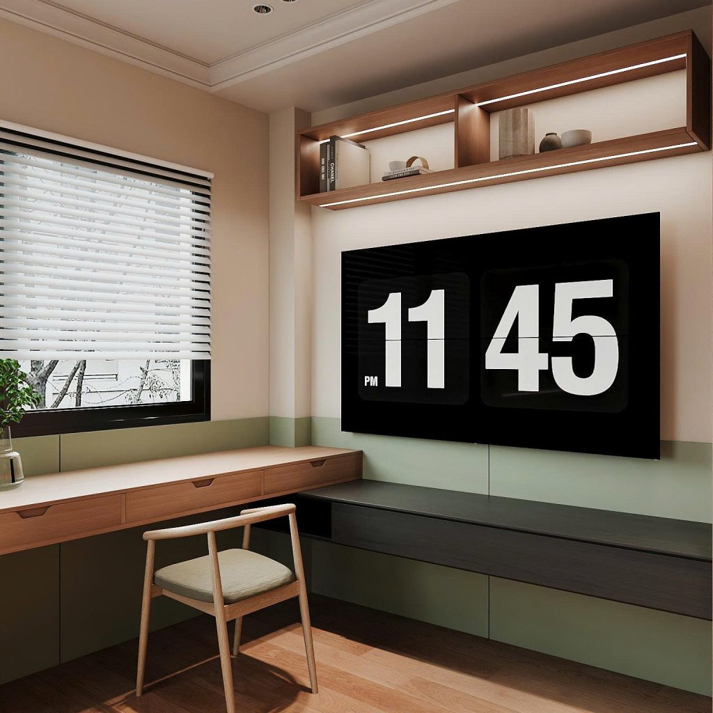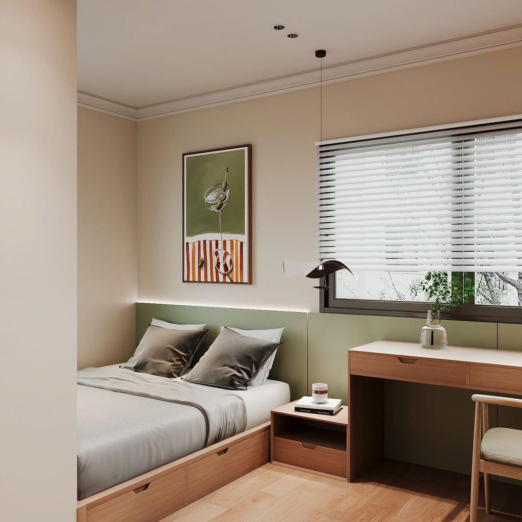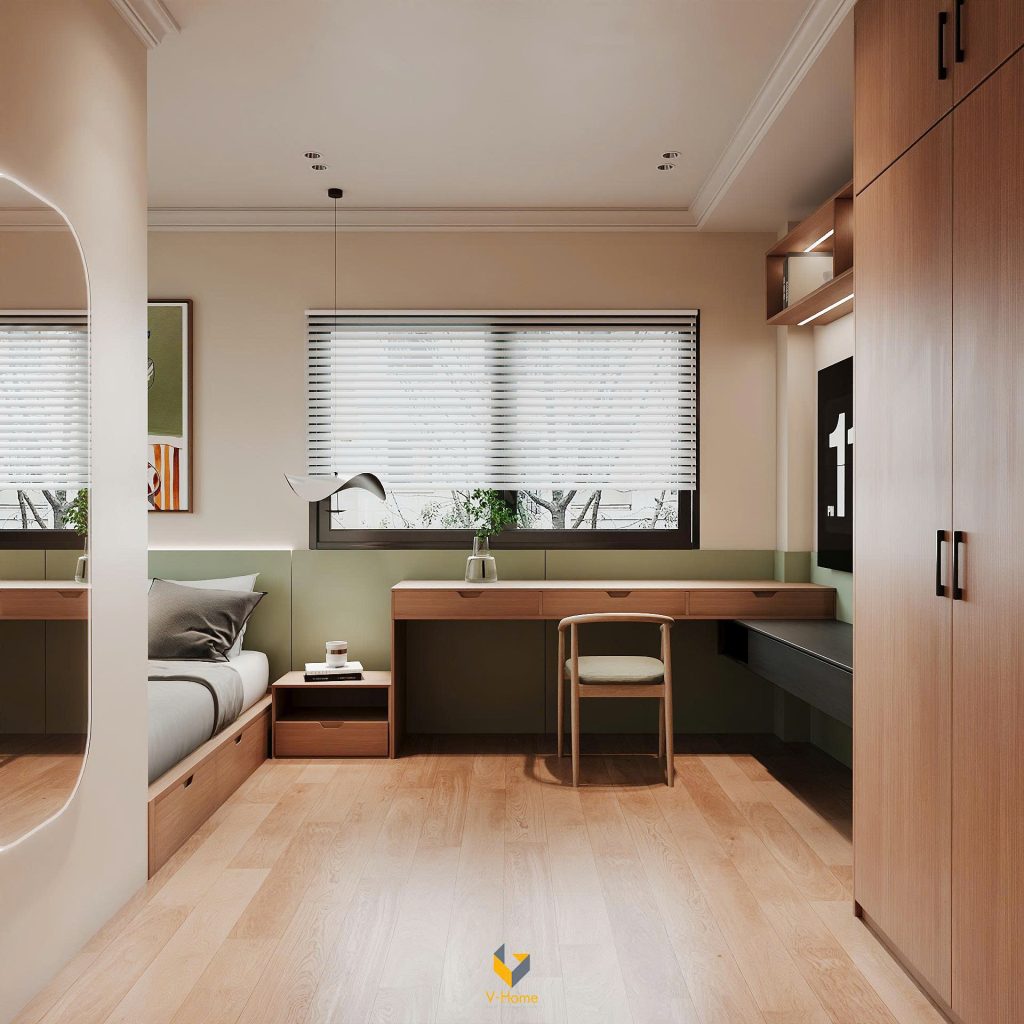 Căn phòng được thiết kế theo phong cách tối giản hiện đại (Modern Minimalism), mang đến sự gọn gàng, tiện nghi và thoáng đãng. Đây là kiểu bố trí phù hợp cho phòng học – phòng ngủ trong các căn hộ đô thị, nơi diện tích cần được tận dụng hiệu quả mà vẫn giữ được sự thẩm mỹ.