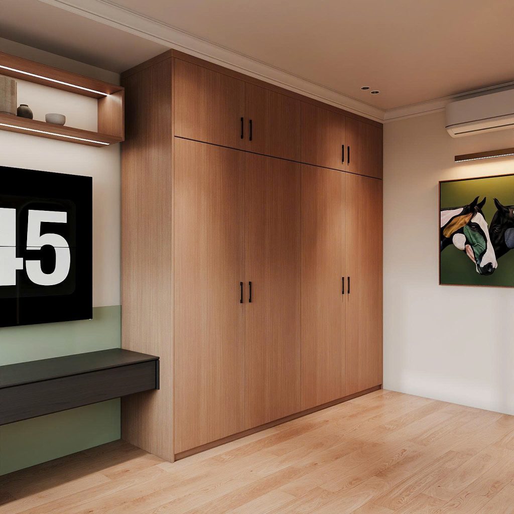 Hệ tủ âm tường: cao kịch trần, màu gỗ sáng, tay nắm đen tạo sự hiện đại và tiết kiệm không gian.