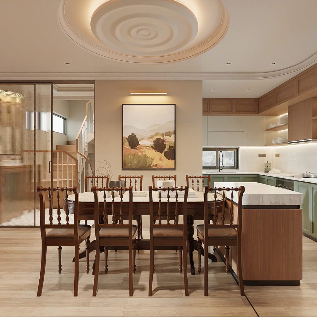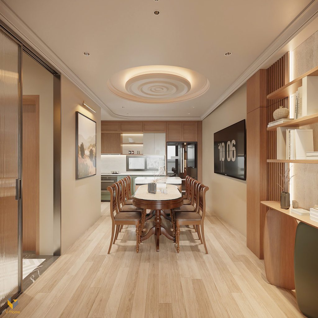 Khi bước vào đây, người xem có thể hình dung ngay ra một không gian không chỉ để nấu ăn mà còn là trái tim của ngôi nhà, nơi lưu giữ những khoảnh khắc ấm áp và gắn kết. Bàn ăn dài bằng gỗ tự nhiên cùng bộ ghế mang hơi hướng cổ điển, tạo điểm nhấn sang trọng, đồng thời là nơi quây quần, kết nối mọi thành viên trong gia đình.