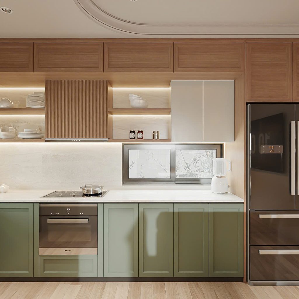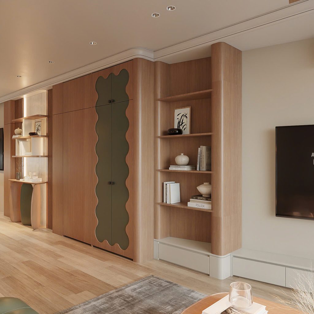 Hệ tủ và kệ âm tường: Thiết kế với đường nét cong mềm, cửa tủ màu xanh olive độc đáo, vừa thẩm mỹ vừa tối ưu diện tích.
