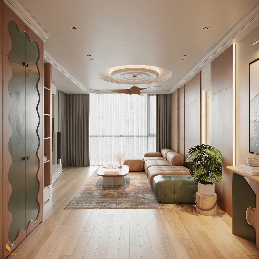Gia chủ với nhu cầu rất cao thẩm mỹ nên các kiến trúc sư của V-Home đã tư vấn và hướng tới phong cách Hiện đại đương đại (Modern Contemporary) với bảng màu trung tính ấm áp, kết hợp khéo léo giữa gỗ tự nhiên, sofa da cao cấp và ánh sáng chan hòa từ ô cửa kính lớn.