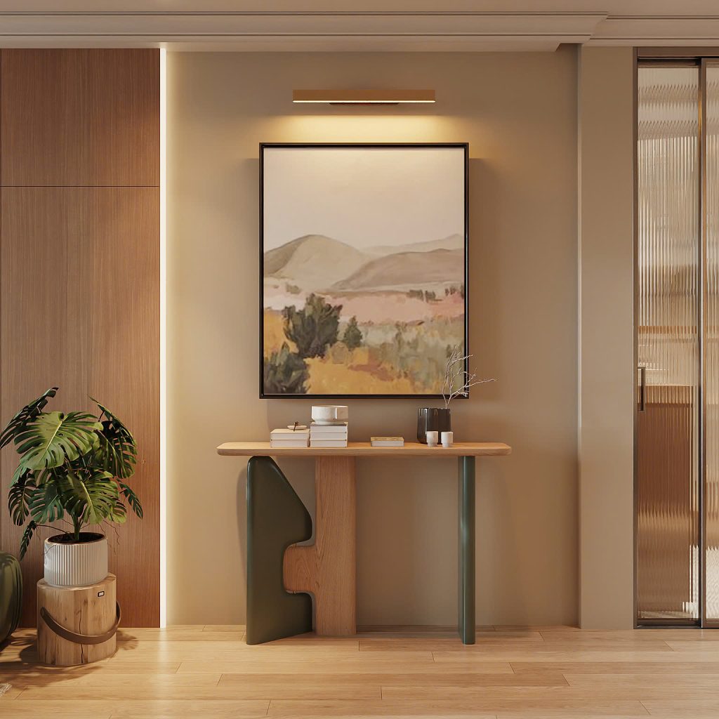 Góc decor nghệ thuật: Bàn console gỗ kết hợp decor tranh treo tường và cây xanh, khiến không gian thêm sinh động và ấm áp.