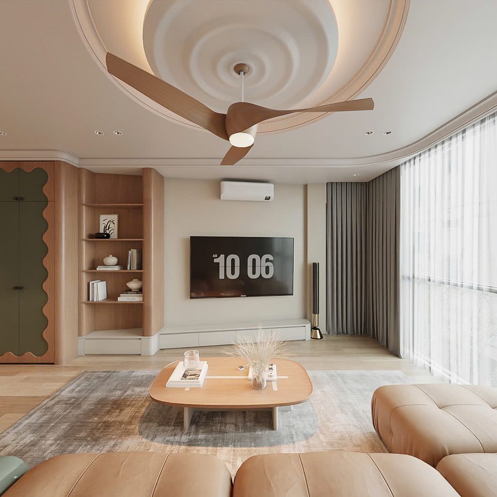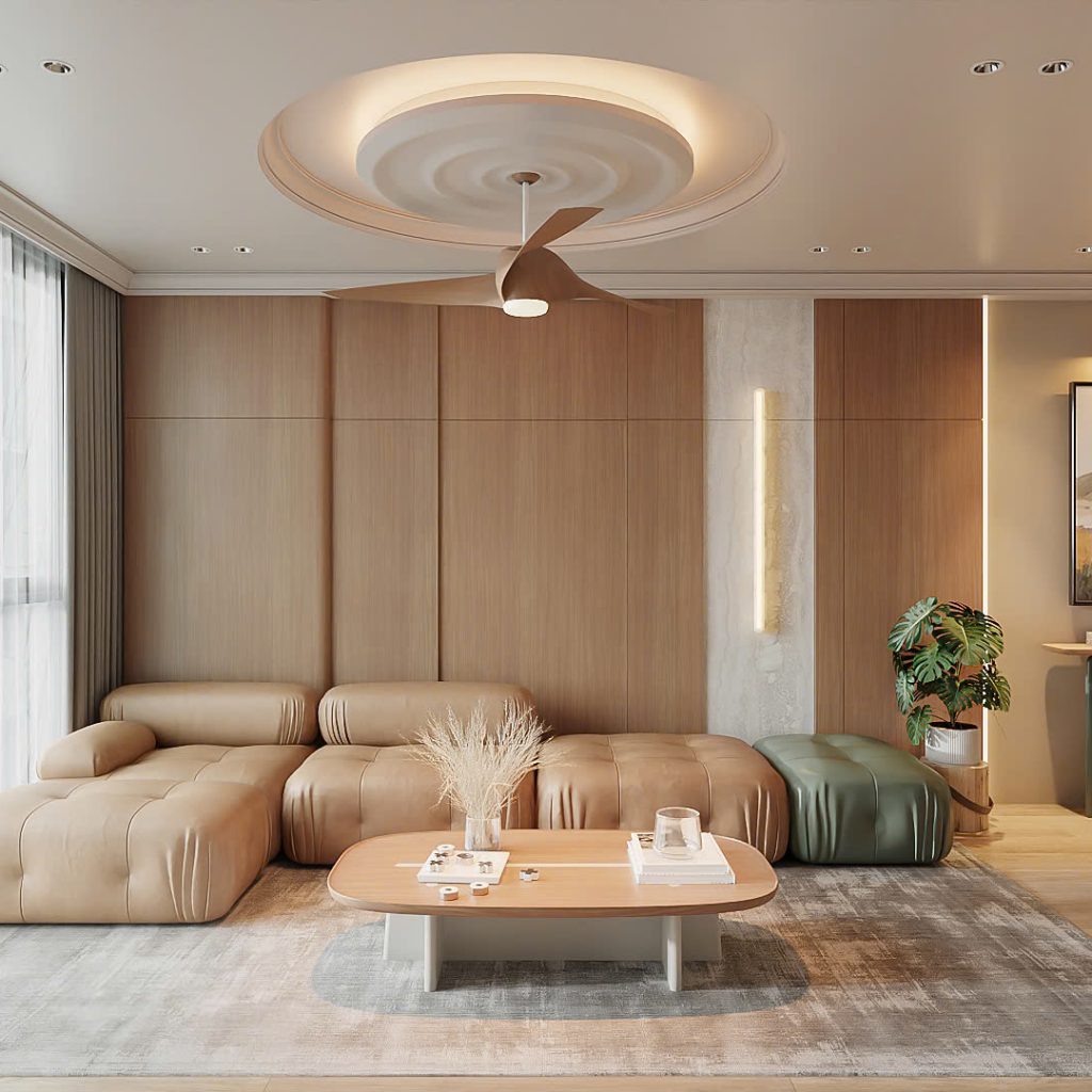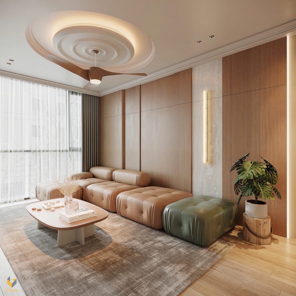 Ngoài ra, điểm nhấn chính là bộ sofa module độc đáo, linh hoạt trong bố trí, cùng trần thạch cao 3D kết hợp quạt trần gỗ thanh thoát mang đến sự hiện đại mà vẫn gần gũi với những người trong nhà.