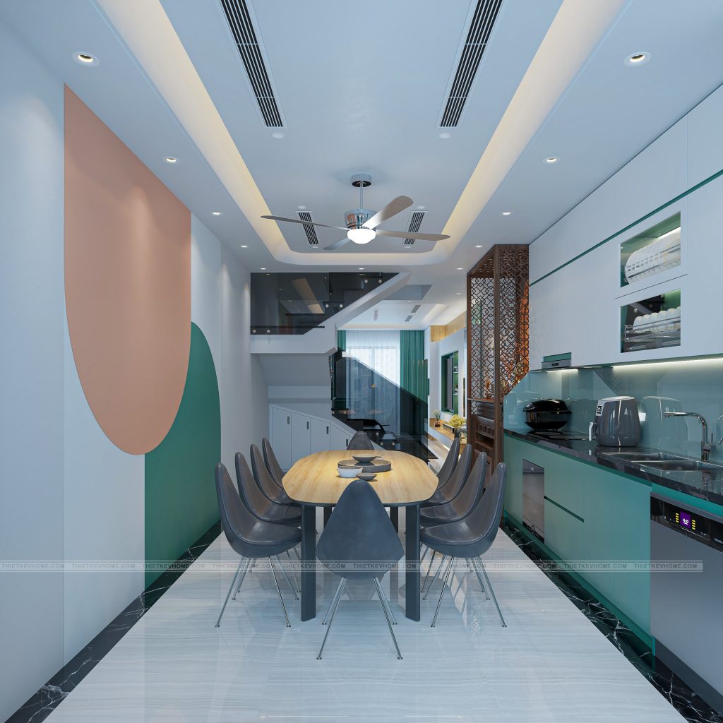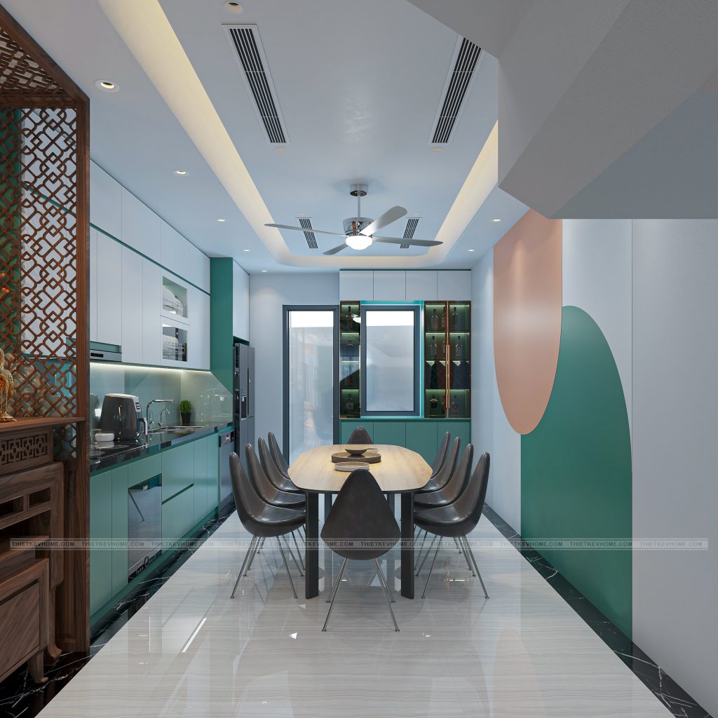Điểm nhấn nổi bật là sự phối hợp màu sắc xanh ngọc – trắng – đen cùng ánh sáng dịu nhẹ, giúp gian bếp vừa tươi sáng, vừa sang trọng.
