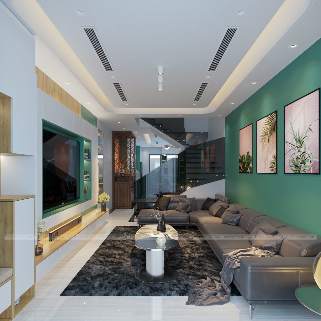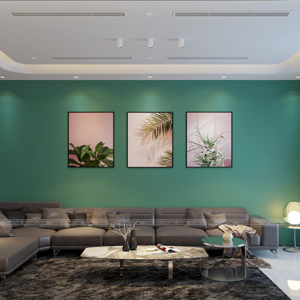 Tường: mảng tường xanh ngọc đậm kết hợp cùng tranh nghệ thuật khung đen, tạo điểm nhấn mạnh mẽ, đồng thời gợi cảm giác thoải mãi, thư giãn, gần gũi thiên nhiên. Hệ tủ tivi & kệ trang trí: thiết kế âm tường, đường nét gọn gàng, có chiếu sáng hắt giúp tạo chiều sâu và nổi bật vật trưng bày.