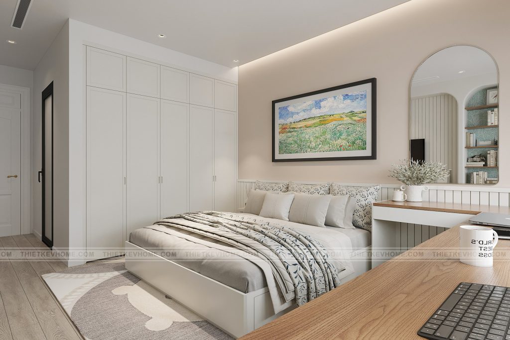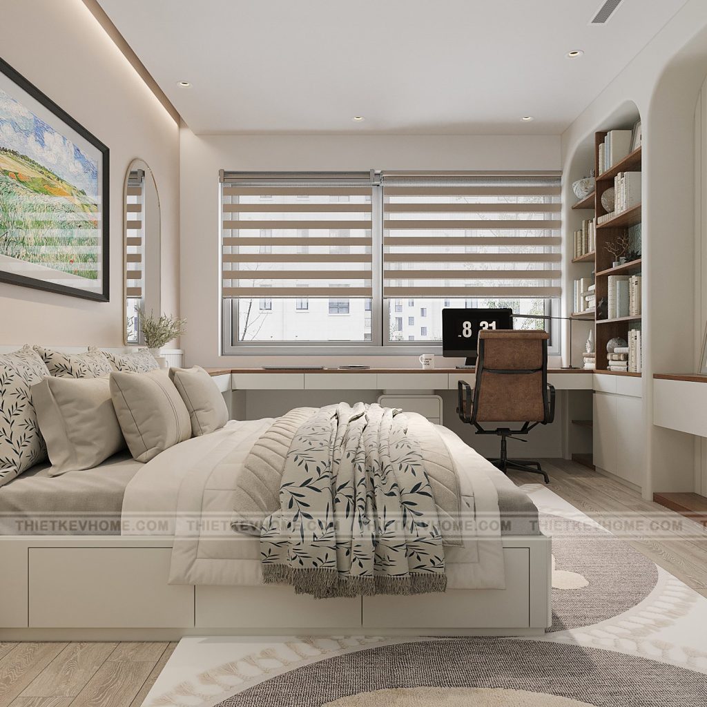 Phòng ngủ được thiết kế theo phong cách hiện đại tối giản (Modern Minimalist), với tông màu chủ đạo là trắng – be – gỗ sáng. Không gian gọn gàng, nhiều ánh sáng tự nhiên, vừa mang lại cảm giác thư giãn, vừa tạo môi trường sống khoa học, tiện nghi.