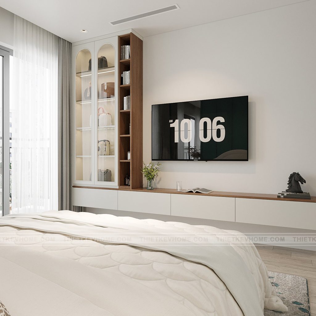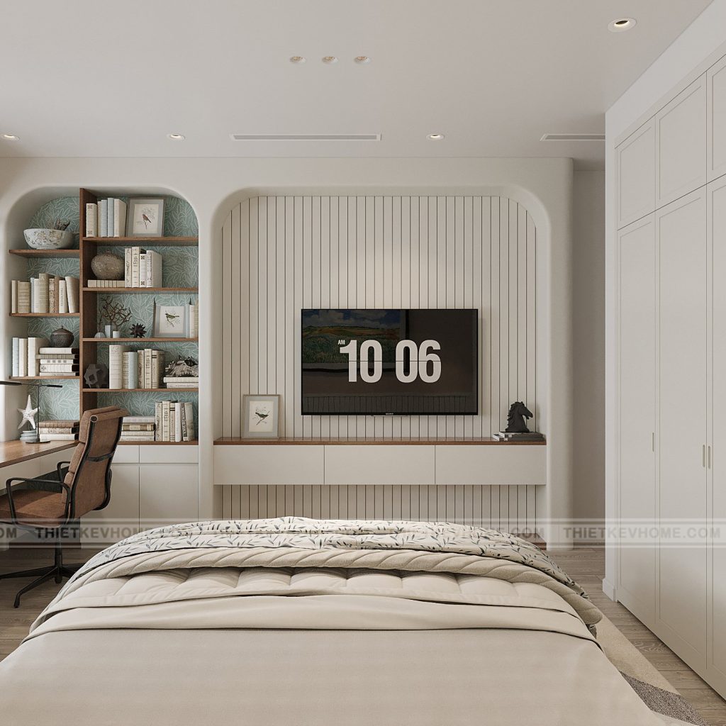 Thiết kế và bố cục: Giường ngủ: dạng hộp, có ngăn kéo dưới, tối ưu lưu trữ cho phòng ngủ diện tích vừa phải. Hệ tủ quần áo kịch trần: thiết kế phẳng, không tay nắm, tạo sự gọn gàng và sang trọng. Bàn học: bố trí cạnh cửa sổ, tận dụng ánh sáng tự nhiên, kết hợp kệ sách âm tường dạng vòm cong – chi tiết mềm mại, nữ tính. Kệ tivi & tủ trang trí: thiết kế liền mạch, kết hợp lam sọc dọc trắng tạo điểm nhấn mà vẫn tinh giản.