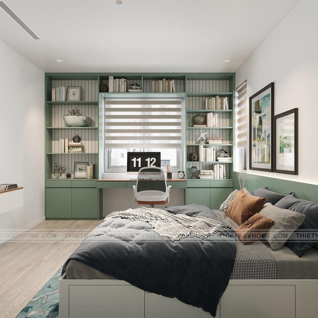 Thiết kế & bố cục: Giường hộp: thiết kế đơn giản, có ngăn kéo lưu trữ, tiết kiệm diện tích. Tủ quần áo kịch trần: màu trắng, phẳng mịn, gọn gàng, phù hợp phong cách tối giản. Bàn học + kệ sách: được bố trí sát cửa sổ để tận dụng ánh sáng tự nhiên. Kệ sách mở, chia nhiều ngăn nhỏ, vừa trưng bày vừa lưu trữ.