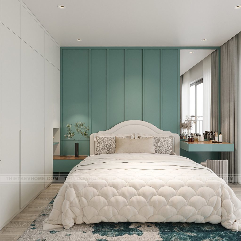 Chúng tôi vẫn sử dụng Chất liệu: gỗ sáng cho sàn, MDF phủ sơn công nghiệp cho tủ, kết hợp kính và gương giúp mở rộng không gian. Màu chủ đạo: trắng thanh lịch và xanh ngọc làm điểm nhấn, tạo sự sang trọng nhưng không lạnh lẽo.
