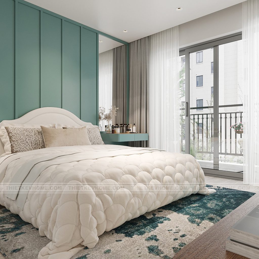 Phòng ngủ master được thiết kế với gam màu chủ đạo trắng – xanh ngọc – gỗ sáng, kết hợp cùng ánh sáng tự nhiên từ ban công lớn. Không gian vừa mang lại sự sang trọng, tinh tế vừa tạo cảm giác thoải mái, thư giãn – đúng chất của một phòng ngủ chính trong căn nhà.