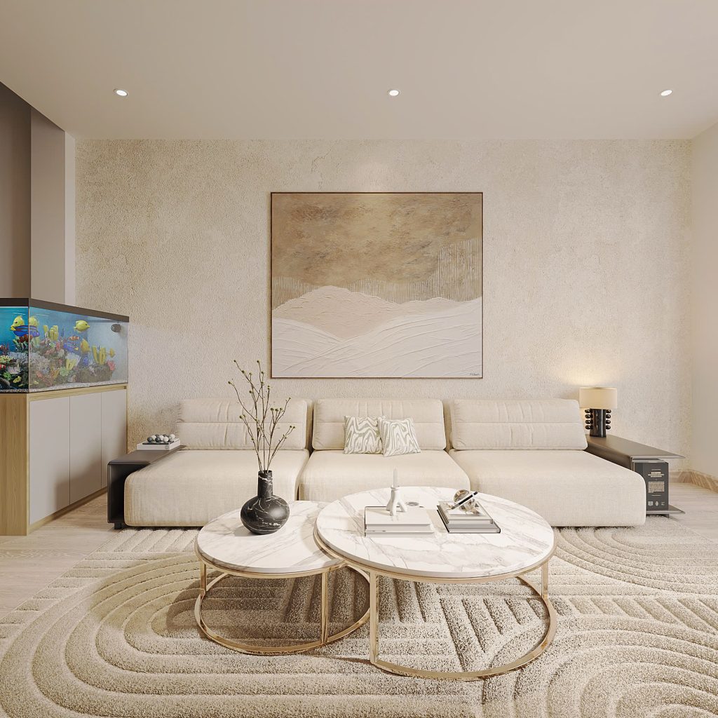 Không gian phòng khách với sự kết hợp tinh tế giữa gam màu trung tính và điểm nhấn nổi bật mang đến sự hiện đại nhưng không quá cầu kỳ. Bố cục được sắp xếp khoa học, tối ưu diện tích nhưng vẫn tạo sự thoáng đãng và thoải mái.