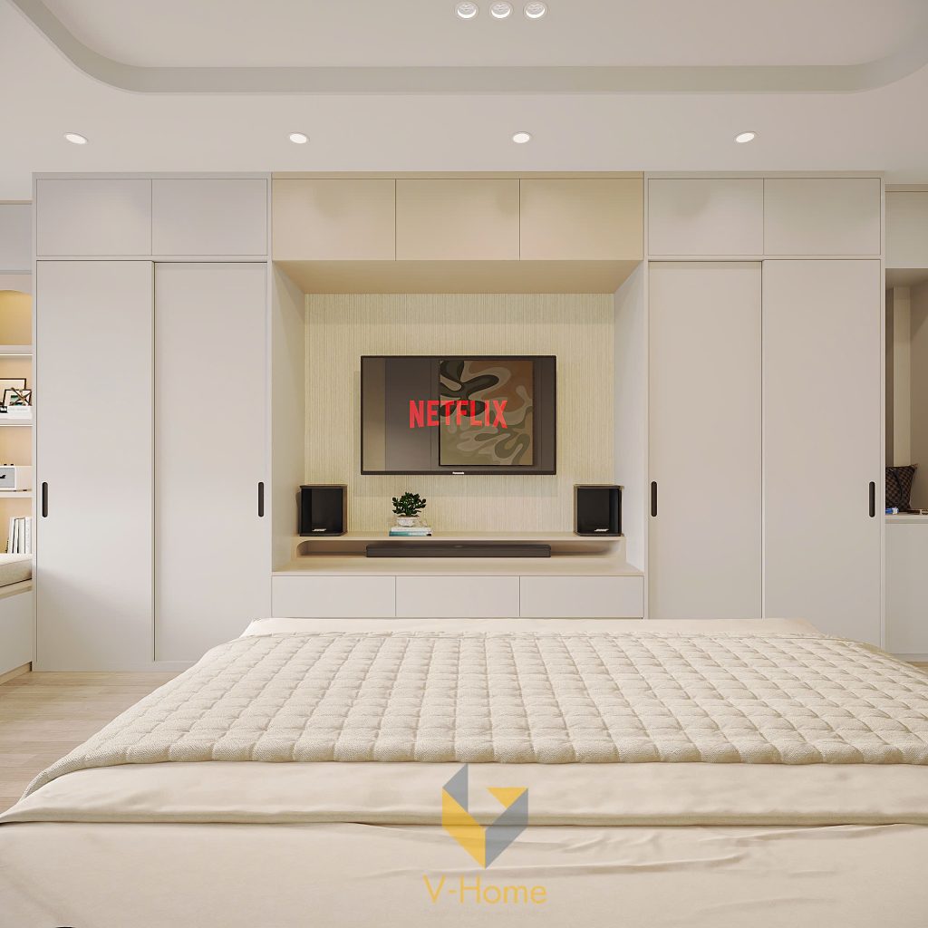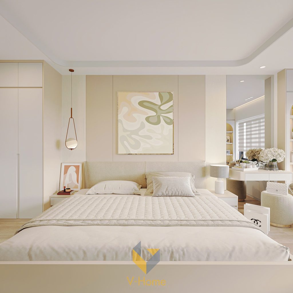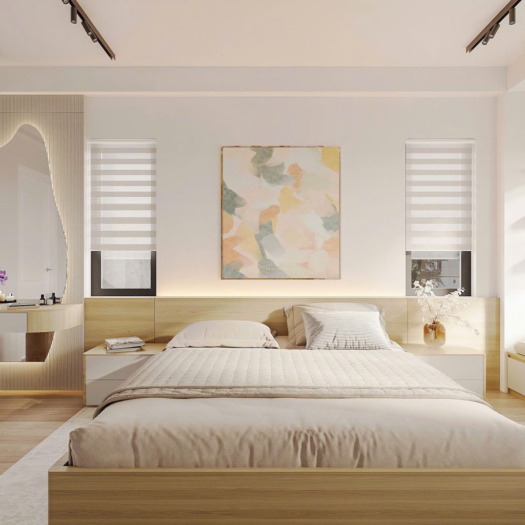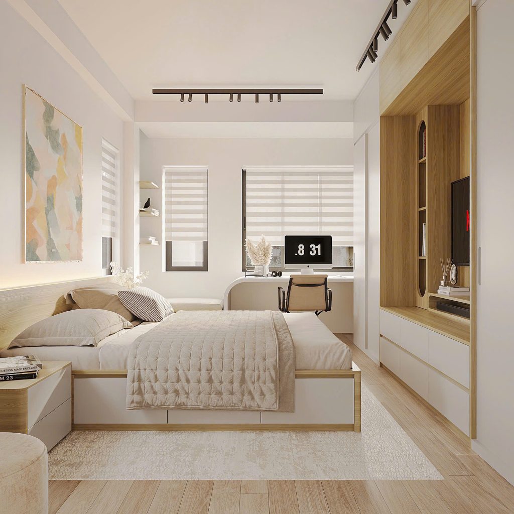 Phòng ngủ được thiết kế theo phong cách hiện đại tối giản (Modern Minimalist), với tông màu chủ đạo là trắng – be – gỗ sáng. Không gian gọn gàng, nhiều ánh sáng tự nhiên, vừa mang lại cảm giác thư giãn, vừa tạo môi trường sống khoa học, tiện nghi.
