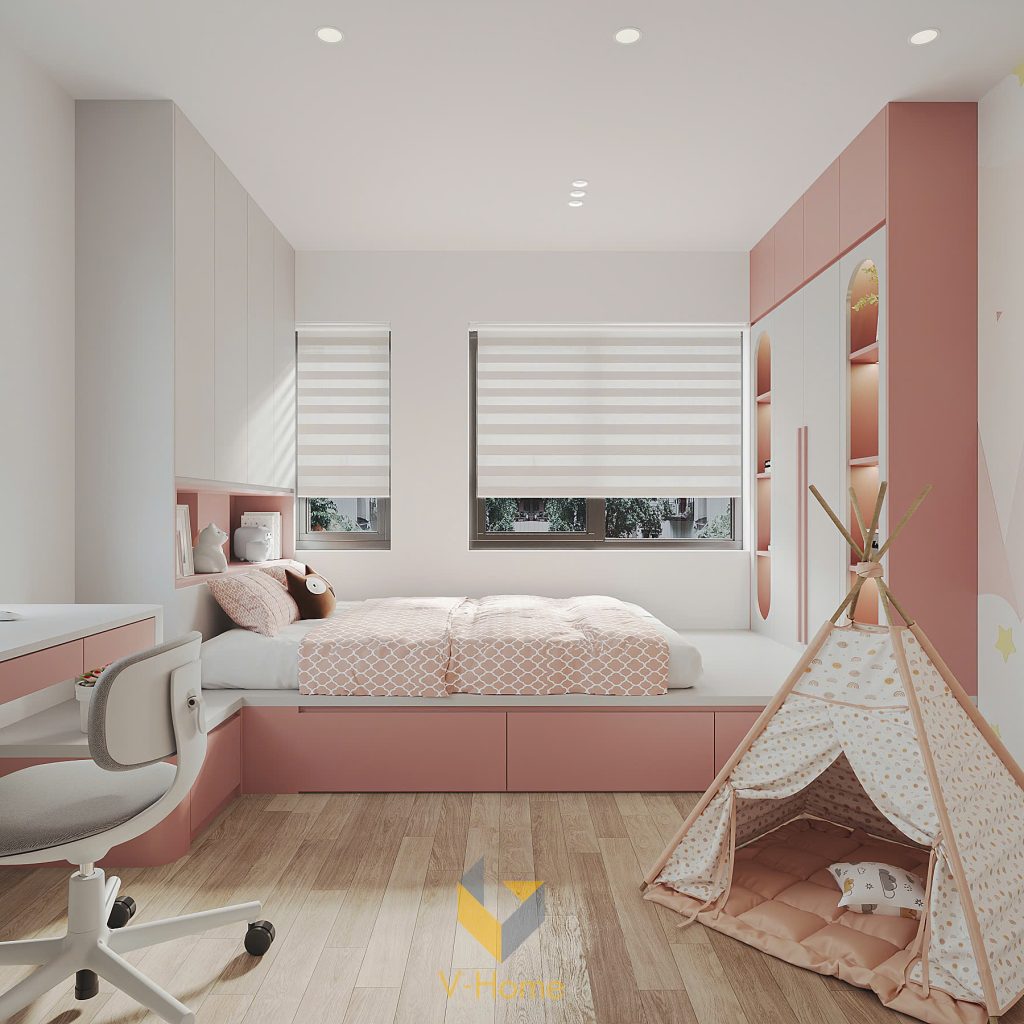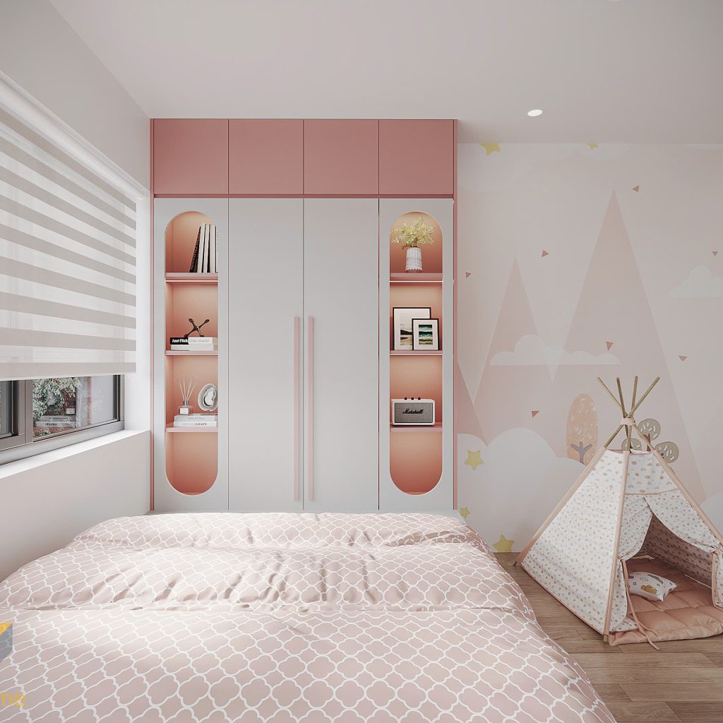 Tạo cảm giác tươi mát, năng động, đồng thời phù hợp với lứa tuổi thiếu niên. Không gian được tổ chức chúng tôi gọn gàng, khoa học, vừa là nơi nghỉ ngơi vừa là góc học tập. Bàn học nhỏ gọn, được đặt cạnh cửa sổ lớn đón trọn ánh sáng tự nhiên, giúp bé hứng thú hơn trong học tập và sáng tạo. Tủ quần áo âm tường phối trắng – hồng hiện đại, cùng hệ kệ trưng bày bo tròn mềm mại, đảm bảo vừa an toàn vừa đẹp mắt.