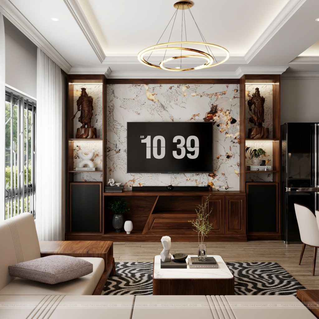 Bên cạnh đó, điểm ấn tượng nhất chính là sự kết hợp nhuần nhuyễn giữa các vật liệu cao cấp trong nhà: Gỗ tự nhiên tông màu nâu trầm với vân gỗ uyển chuyển xuất hiện xuyên suốt từ kệ TV, tủ trang trí đến bàn ăn. Chất liệu này đóng vai trò “mỏ neo” cảm xúc, tạo cảm giác ấm áp và vững chãi. Mảng tường sau TV sử dụng đá Marble màu trắng vân mây bản lớn với những đường vân vàng nâu tạo điểm nhấn quyền quý và cực kỳ bắt mắt. Tủ rượu với cửa kính tối màu kết hợp đèn LED thanh mảnh bên trong giúp không gian trở nên sâu và lung linh hơn vào ban đêm.