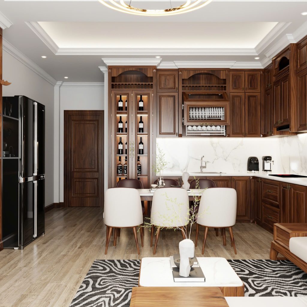 Sử dụng tông màu trung tính làm chủ đạo (Trắng – Nâu – Đen). Sự tương phản giữa sắc trắng của trần/tường và sắc trầm của gỗ tạo nên chiều sâu thị giác tuyệt vời. Ánh sáng nhân tạo: Hệ thống đèn âm trần kết hợp với đèn hắt (ambient lighting) ở các hộc tủ không chỉ để chiếu sáng mà còn là một thủ pháp trang trí, tôn vinh những món đồ decor như tượng gỗ hay chai rượu quý.