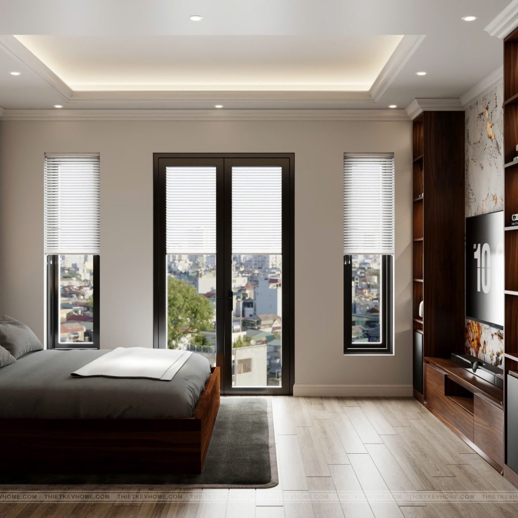 Chúng ta không thể không nói tới một yếu tố góp phần nâng tầm thiết kế lên đó chính là – ‘Ánh sáng tự nhiên’: Hệ cửa sổ lớn với rèm sáo cho phép điều chỉnh ánh sáng linh hoạt, giúp căn phòng luôn thông thoáng vào ban ngày.