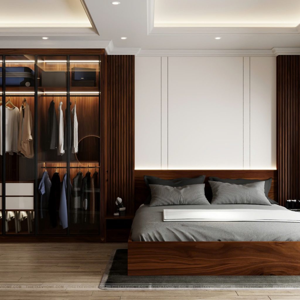 Điểm nhấn đắt giá nhất khi bước chân vào căn phòng này chính là hệ tủ quần áo cánh kính: Việc sử dụng kính cường lực khung nhôm thanh mảnh giúp không gian như rộng mở hơn, không bị bí bách như các hệ tủ gỗ kín mít truyền thống. Hệ thống đèn chạy dọc các ngăn tủ không chỉ giúp gia chủ dễ dàng chọn đồ mà còn biến những bộ trang phục, phụ kiện trở thành những món đồ decor xa xỉ. Sự tương phản giữa gỗ nâu trầm và kính tạo nên vẻ đẹp hiện đại, lịch lãm.