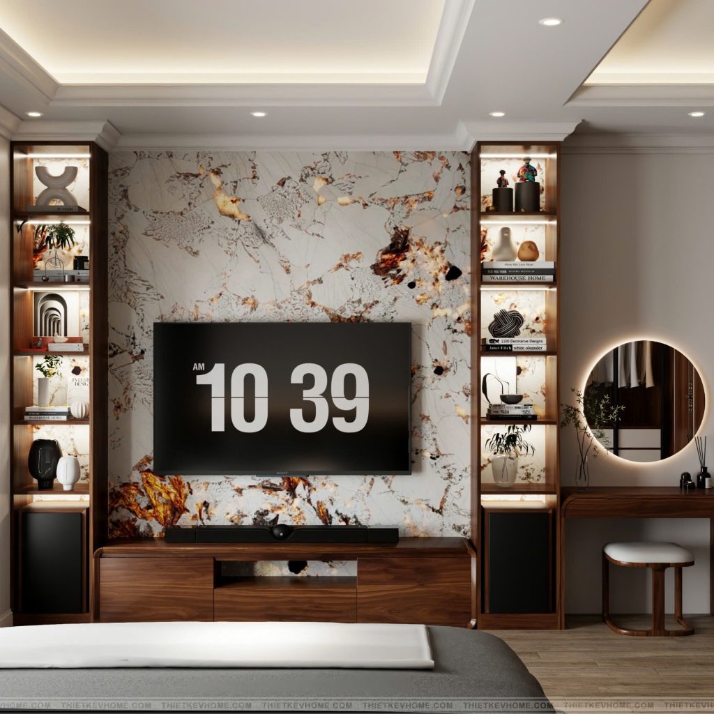 Đối diện bên đó là khu vực giải trí và bàn trang điểm: Tinh tế trong từng chi tiết. Việc các V-Home sử dụng lại mẫu đá trắng vân vàng từ phòng khách giúp duy trì sợi dây liên kết thẩm mỹ cho toàn bộ căn nhà.