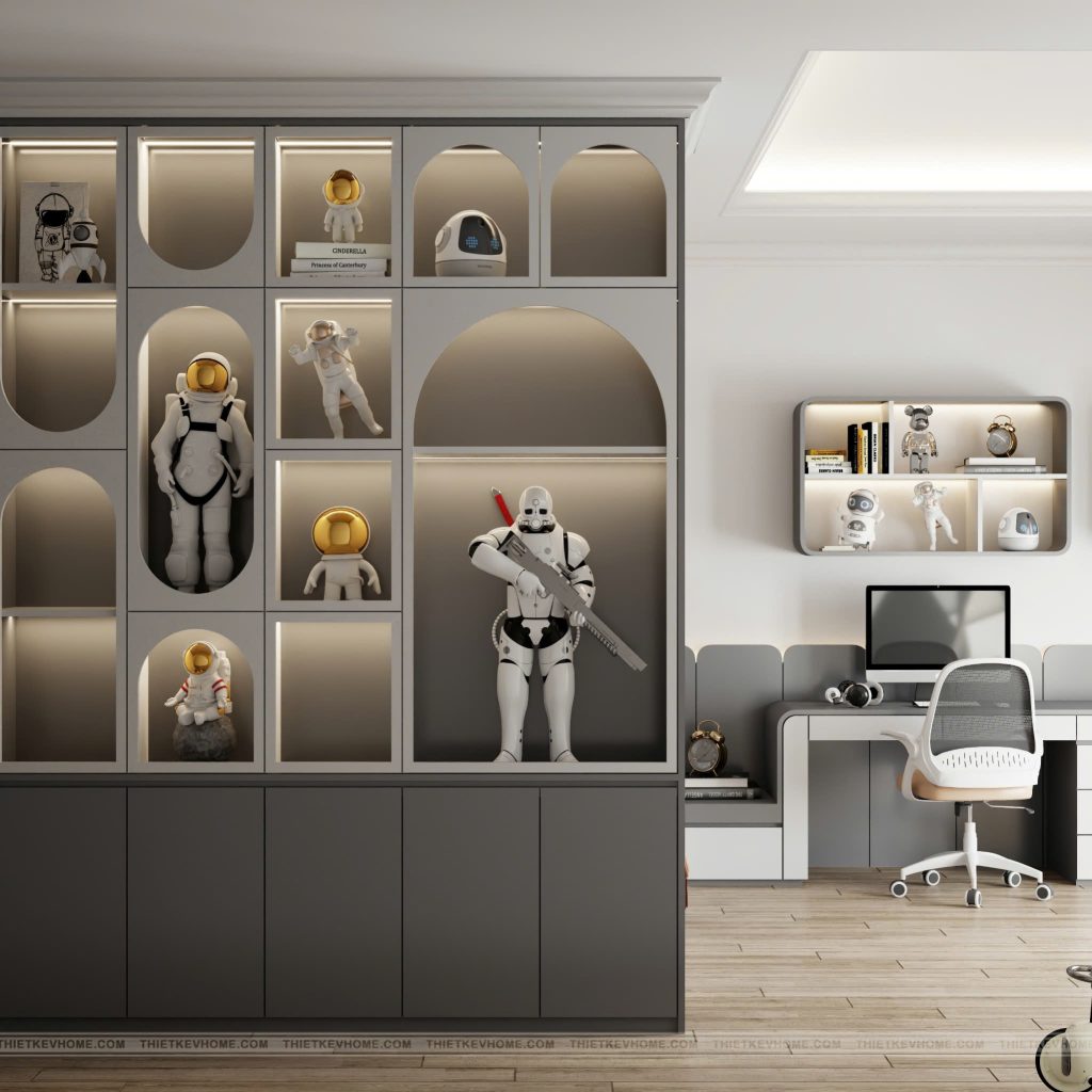 Hệ tủ trưng bày độc đáo: Các hộc tủ được thiết kế với những đường bo cong dạng mái vòm, gợi liên tưởng đến cửa sổ của những con tàu vũ trụ, nơi trưng bày các mô hình Robot và đồ chơi yêu thích.