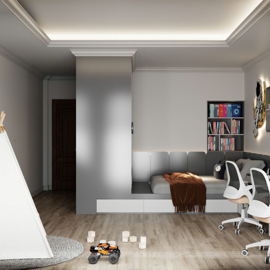 Ngoài ra, màu sắc với Tông màu hiện đại: Khác với những phòng trẻ em truyền thống dùng màu sắc sặc sỡ, căn phòng này sử dụng tông ‘Ghi xám – Trắng’ làm chủ đạo, kết hợp với sàn gỗ ấm áp. Cách phối màu này giúp căn phòng giữ được vẻ hiện đại và có thể sử dụng lâu dài khi trẻ lớn lên mà không bị “trẻ con” quá mức. Bên cạnh đó, hệ đèn âm trần và đèn hắt tủ được chùng tôi tính toán kỹ lưỡng, đảm bảo độ sáng cần thiết cho việc học tập nhưng không gây chói mắt, bảo vệ cho trẻ.