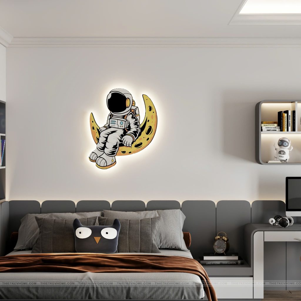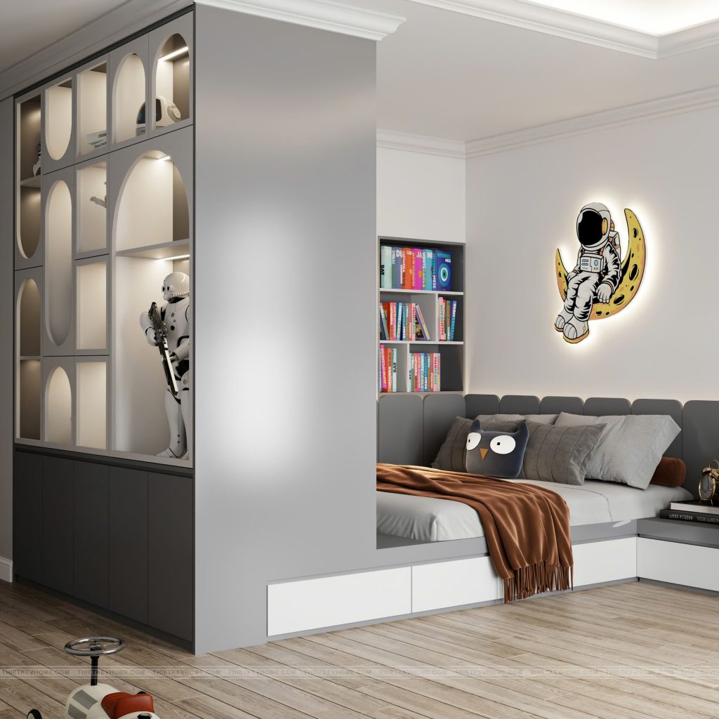 Trái ngược với sự trầm mặc của phòng Master, không gian Phòng ngủ cho bé là một sự bứt phá đầy sáng tạo với chủ đề “Du hành vũ trụ” (Space Adventure). Đây là một thiết kế thông minh, tối ưu hóa diện tích nhưng vẫn nuôi dưỡng được trí tưởng tượng phong phú cho trẻ.