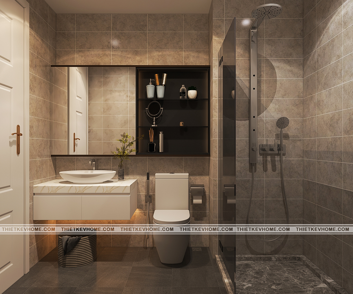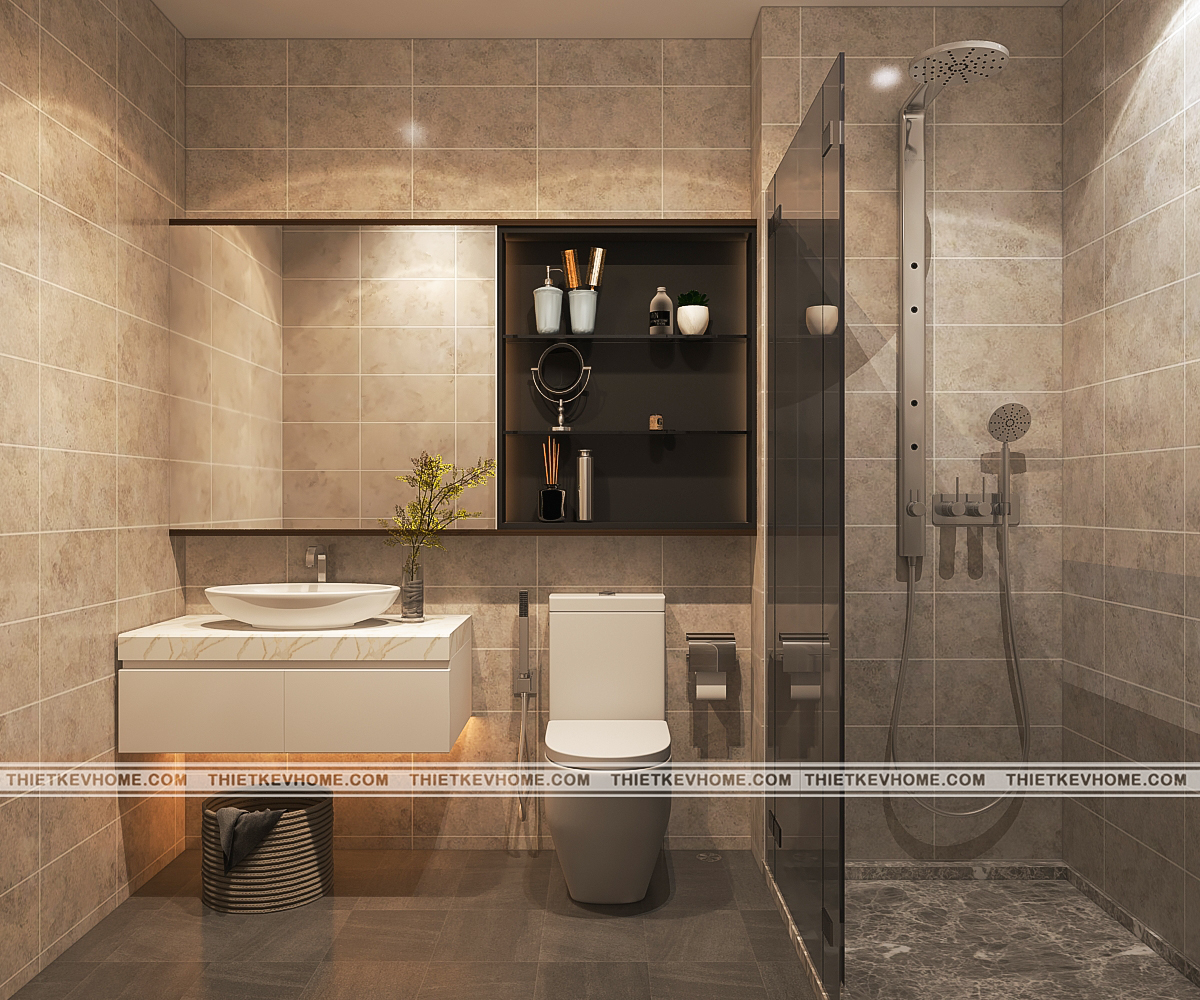 Thiết kế nội thất phòng wc với vách kính tắm đứng mang tới cảm giác cơi nới không gian, khô thoáng và sạch sẽ.
