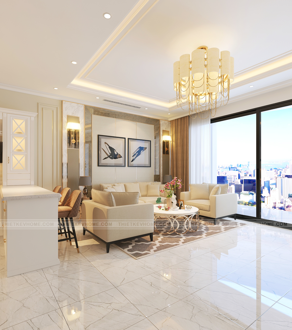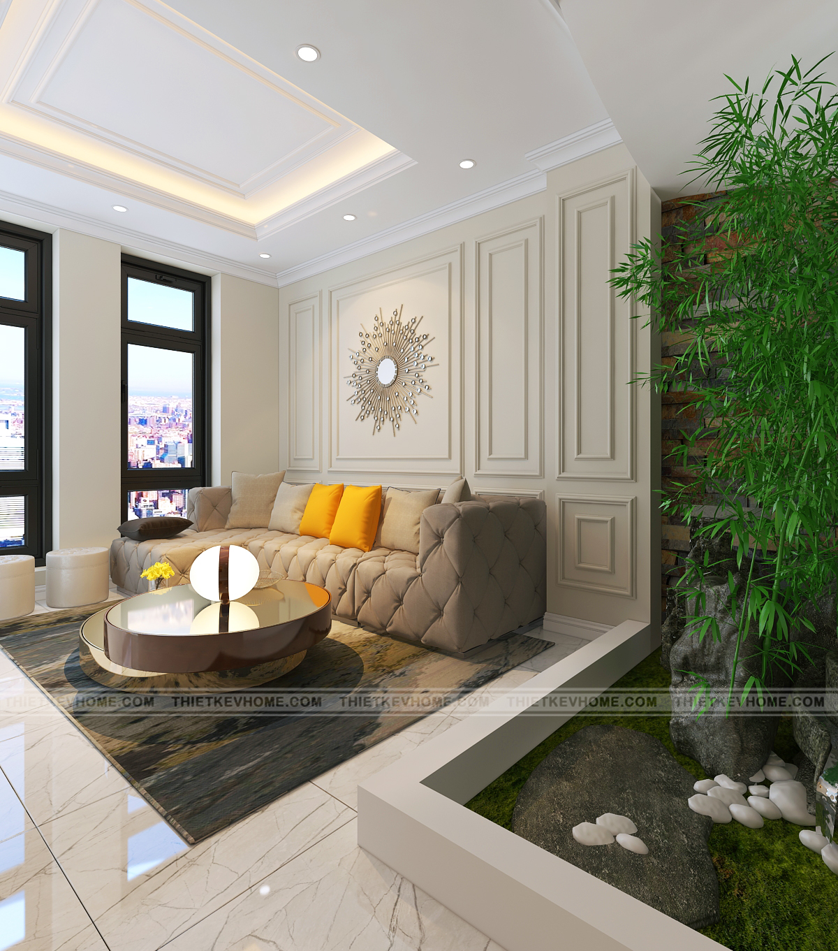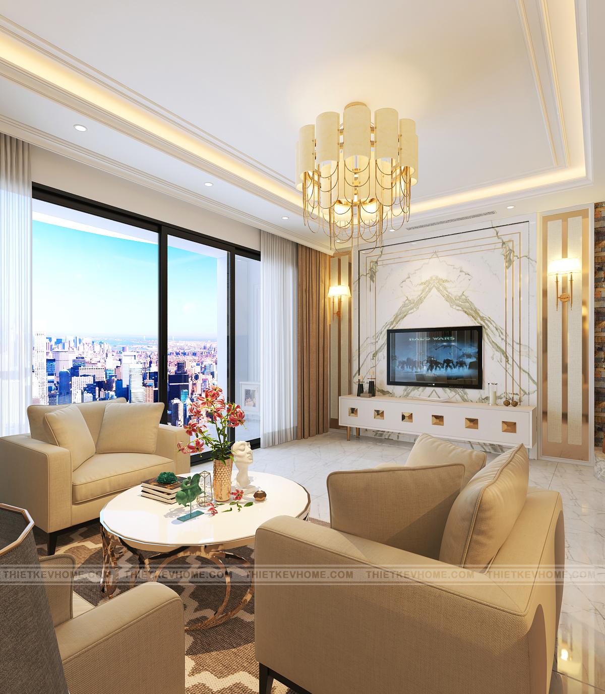 Đặc điểm nổi bật của phong cách luxury là sử dụng các vật liệu cao cấp, nẹp đồng trang trí tạo điểm nhấn. Dưới bàn tay và khối óc của các kiến trúc sư, căn hộ được vận dụng linh hoạt trong sử dụng ánh sáng và màu sắc tạo nên hiệu ứng tổng thể hài hòa, và bắt mắt. Vách ốp đá sau kệ ti vi được ghép đối xứng là nét chấm phá của phong cách này.